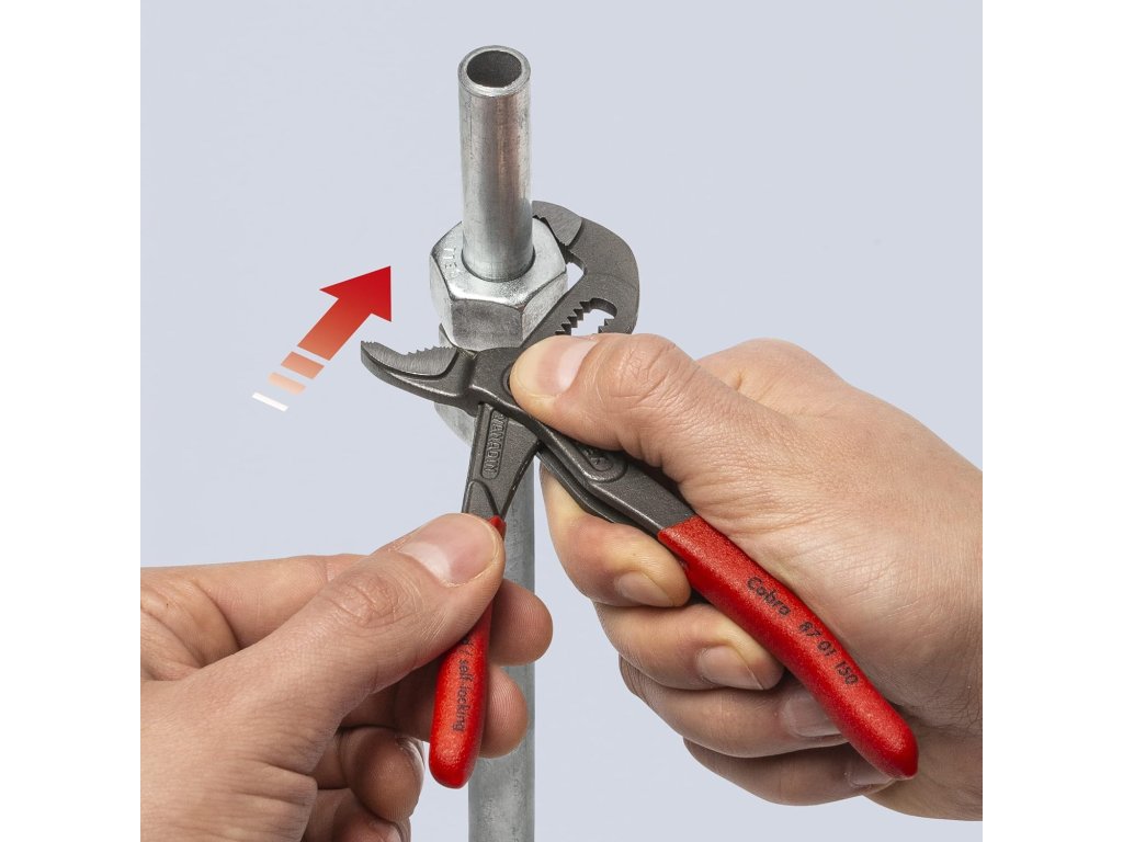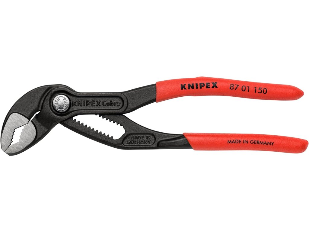 Kompaktní high tech kleště na vodní pumpy KNIPEX Cobra o délce 150 mm vyrobené z chrom vanadiové oceli. Nabízejí o 30% vyšší kapacitu než běžné kleště samočinné sevření a ochranu proti skřípnutí prstů. Mají 11 nastavitelných pozic pro průměry trubek až 1 1/4 palce (32 mm).