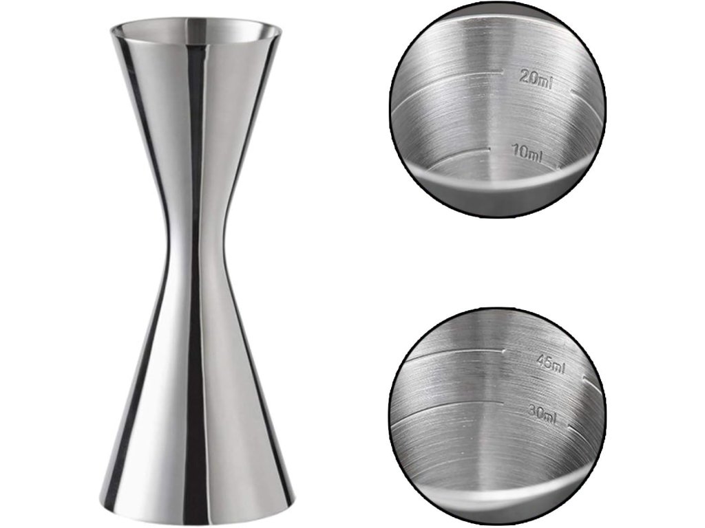 Každá strana odměrky má jasně vyznačené rysky pro přesné odměření ingrediencí. Strana o objemu 30 ml má rysky na 10 ml a 20 ml, zatímco strana o objemu 60 ml má rysky na 30 ml a 45 ml. Díky tomu dosáhnete vždy perfektních výsledků při míchání koktejlů.