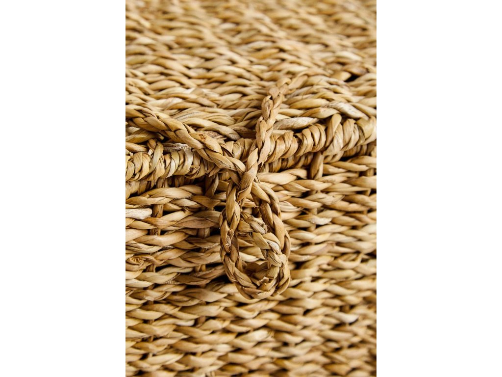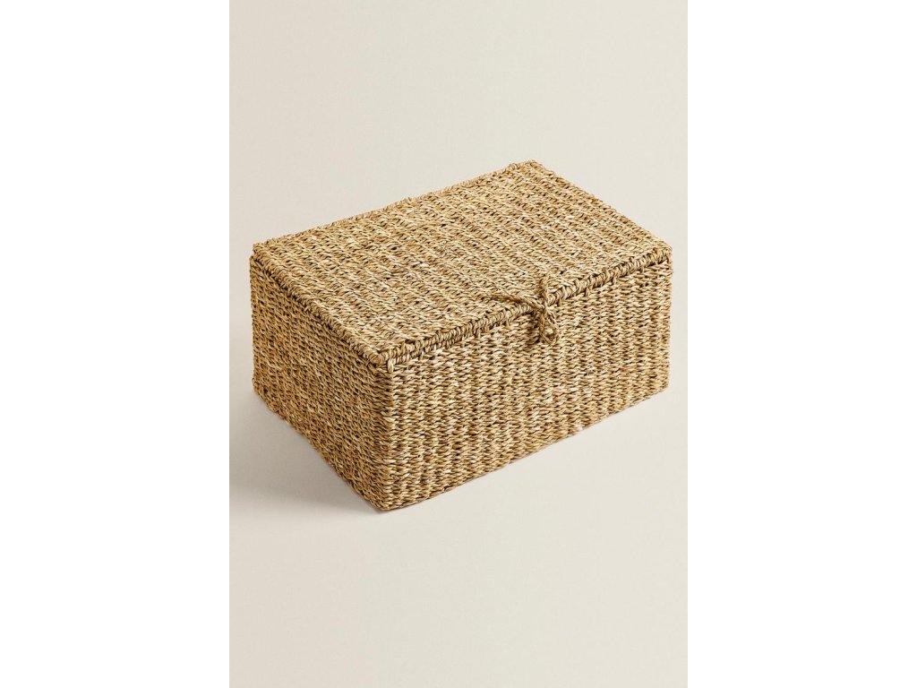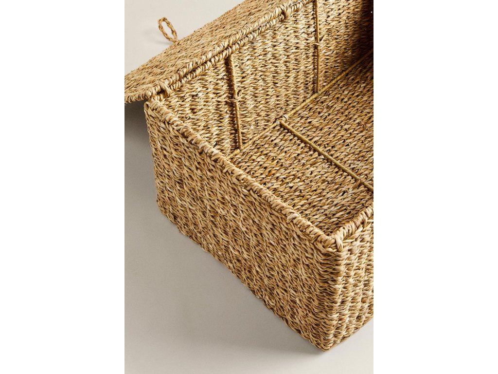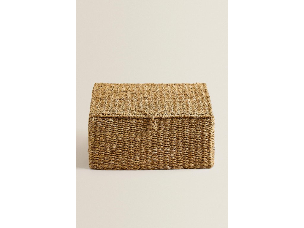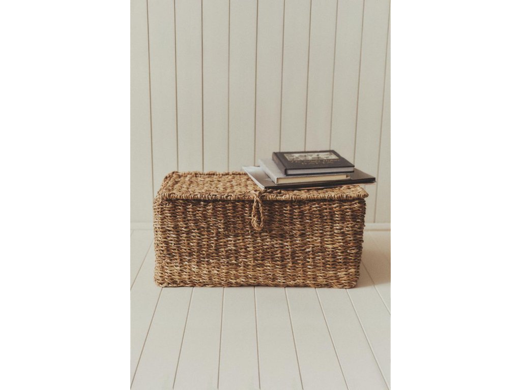 Úložný koš z mořské trávy (Seagrass) s víkem je stylový a praktický doplněk pro úklid a organizaci. Jeho rozměry jsou 53x37x25 cm. Je vyroben především z mořské trávy s příměsí dalších materiálů. Víko pomáhá udržovat uložené předměty mimo dohled a chráněné před prachem.