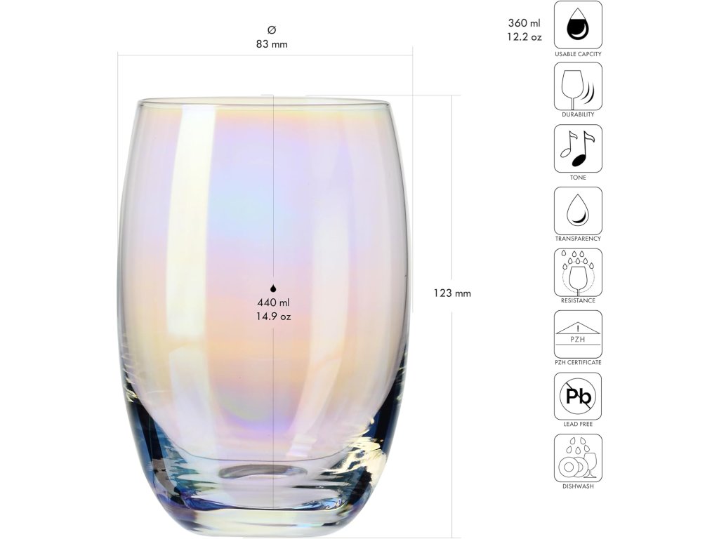 Kvalita zpracování je podpořena zkušeností evropského výrobce, který se zaměřuje na působivé skleněné výrobky. Sklo je pečlivě opracováno, aby poskytovalo dlouhodobé používání bez výrazného opotřebení a zároveň ladilo s moderním interiérem. Díky duhovému efektu se sklenice hodí i jako dekorativní prvek při slavnostních příležitostech či jako stylový doplněk běžného stolování.