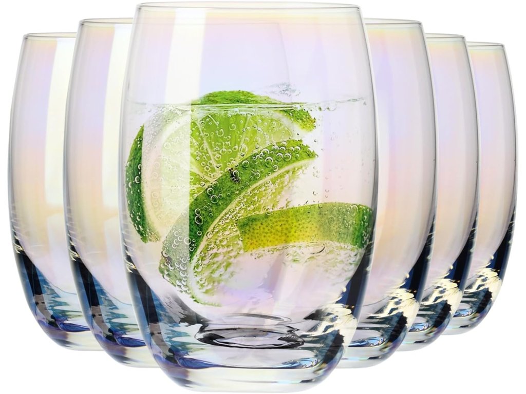 Tato sada sklenic od evropského výrobce Krosno kombinuje čistý minimalistický design s dekorativním duhovým leskem, který dodá stolu výraznější vizuální ztvárnění. Každá sada obsahuje 6 kusů s objemem 360 ml, což je univerzální velikost pro běžné pití i servírování osvěžujících nápojů.