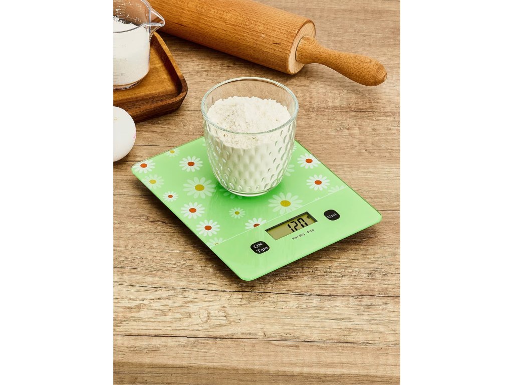Oživte svou kuchyň s touto stylovou kuchyňskou váhou s veselým květinovým vzorem na snadno udržovatelné skleněné horní straně. Nabízí přesné vážení s rozlišením na 1 gram a praktickou funkci tárování pro odečtení hmotnosti nádoby. Díky kompaktním rozměrům cca 15 x 19 x 2 cm nezabere na lince mnoho místa. Pro provoz budete potřebovat 2 x 1,5 V AAA baterie (nejsou součástí balení).