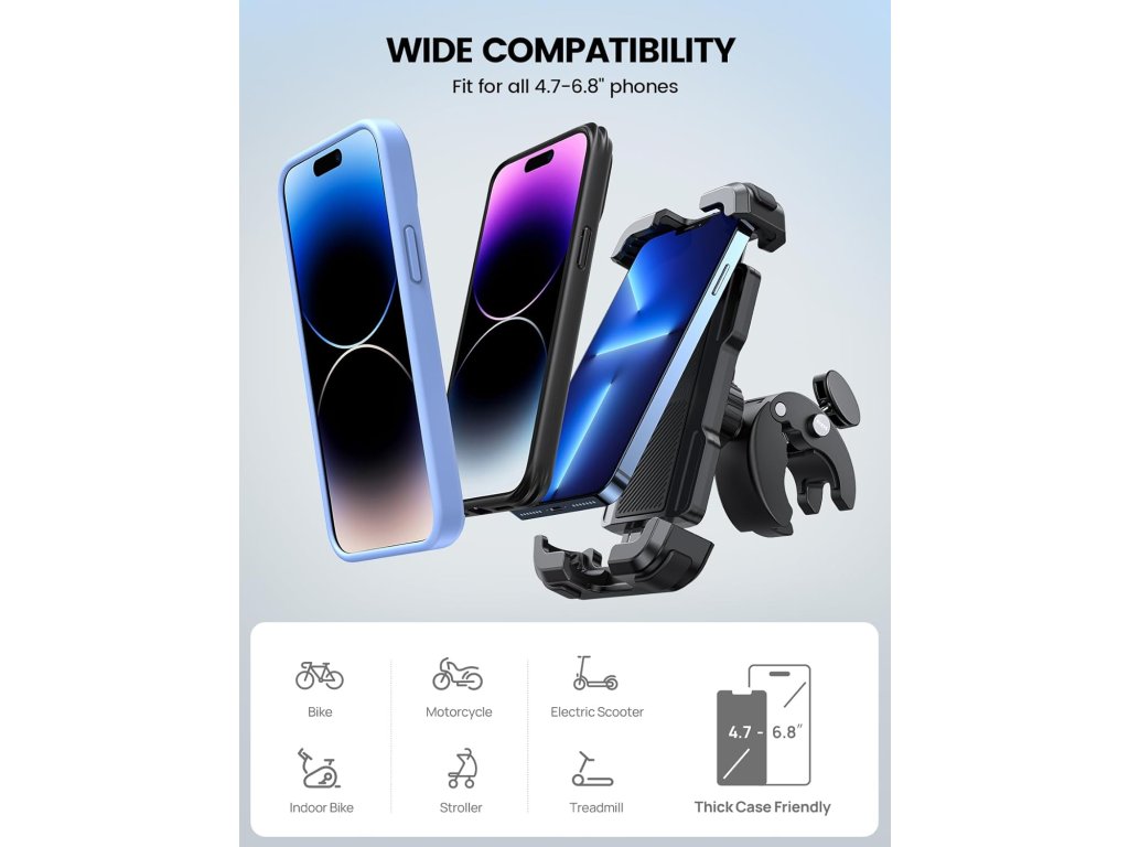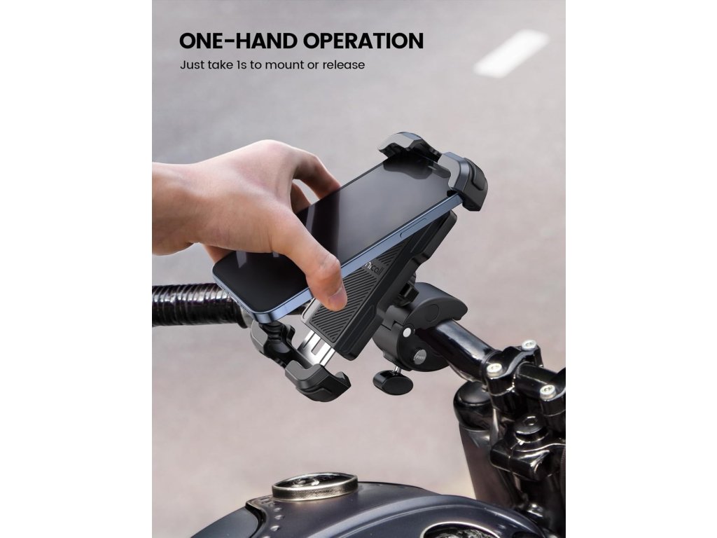 Tento černý držák na telefon od značky Lamicall je ideální pro motorky a kola. Díky rychloupínacímu mechanismu ho na řídítka snadno připevníte bez použití nářadí. Držák je navržen pro telefony s úhlopříčkou 4,7–6,8 palců a díky silikonovému polstrování je váš telefon chráněn proti poškrábání a nárazům.
