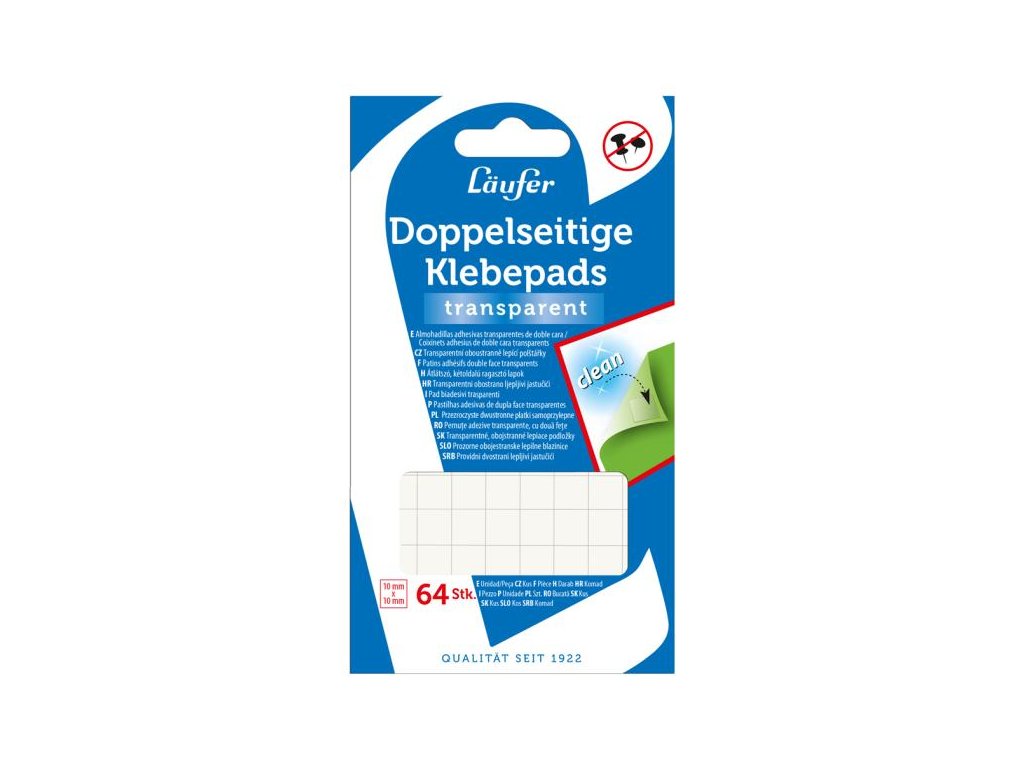 LÄUFER Lepicí podložky jsou průhledné, oboustranné samolepicí tečky o rozměrech 10x10 mm, balené po 64 kusech. Jsou určeny pro neviditelné a spolehlivé upevnění malých předmětů, fotografií, plakátů a okenních dekorací na většině hladkých povrchů. Lze je beze stopy odstranit.