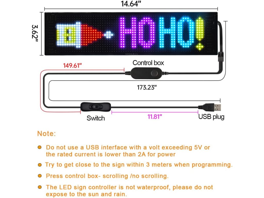 Flexibilní LED panel s Bluetooth ovládáním přes mobilní aplikaci. Snadno vytvářejte a upravujte vlastní texty, vzory a animace. Podpora různých formátů zobrazení s inteligentním skrolováním. Rozměry panelu jsou přibližně 14.64 x 3.62 palce. Tenký a lehký design z FPCB materiálu umožňuje ohyb a přizpůsobení různým povrchům. Povrch panelu je chráněn koloidální pryskyřicí proti poškození statickou elektřinou a mechanickému poškození. Napájení přes USB 5V (doporučeno 2A adaptér nebo powerbanka, možnost napájení z autozapalovače 5V/2A). Jednoduchá instalace pomocí 3M samolepky. Široké využití jako LED obrazovka, autosvětelná reklama, informační tabule pro obchody, bary, klenotnictví, hotely a další veřejná místa.