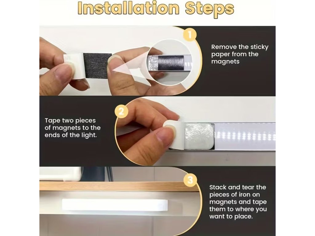 Svítidlo disponuje integrovanou baterií, kterou lze snadno dobíjet pomocí přiloženého USB kabelu, takže nemusíte neustále dokupovat klasické baterie. Instalace je díky magnetickému systému blesková a nevyžaduje žádné vrtání – stačí nalepit kovový pásek na vybrané místo a světlo k němu jednoduše přichytit. Tento systém navíc umožňuje svítidlo kdykoliv sejmout a použít jej jako přenosnou svítilnu v případě potřeby.