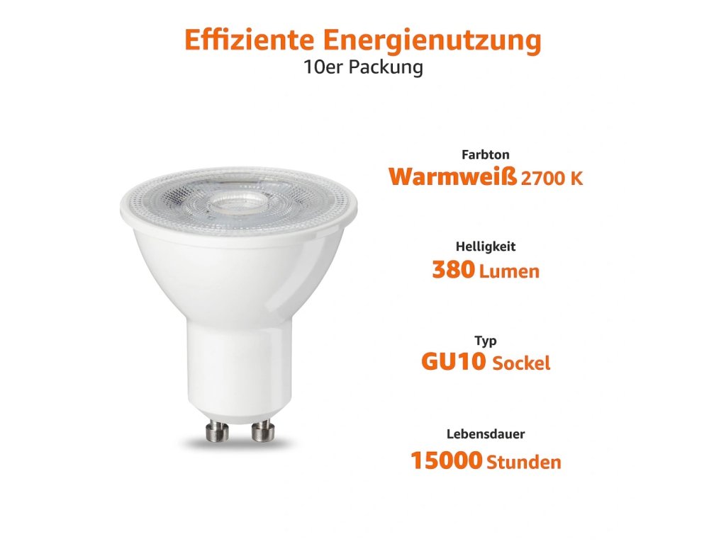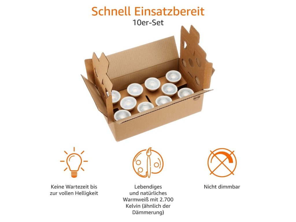 Tato sada obsahuje 10 LED žárovek AmazonBasics s paticí GU10 a vyzařuje bílé světlo. Každá žárovka má příkon pouhé 3 W, což znamená nízkou spotřebu energie a dlouhou životnost. Jsou ideální pro bodové osvětlení v různých místnostech vašeho domu.