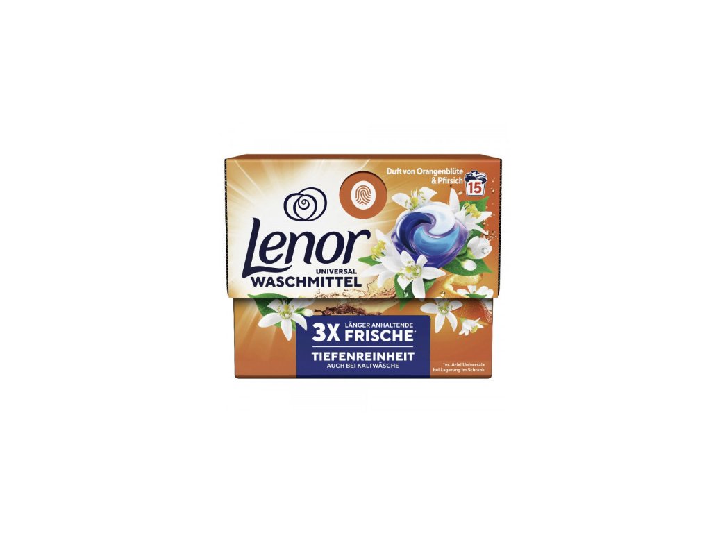 Kapsle na praní Lenor Pods 3in1 Oro s obsahem 15 kusů. Tyto kapsle nejen účinně vyperou prádlo, ale dodají mu i dlouhotrvající svěží vůni.