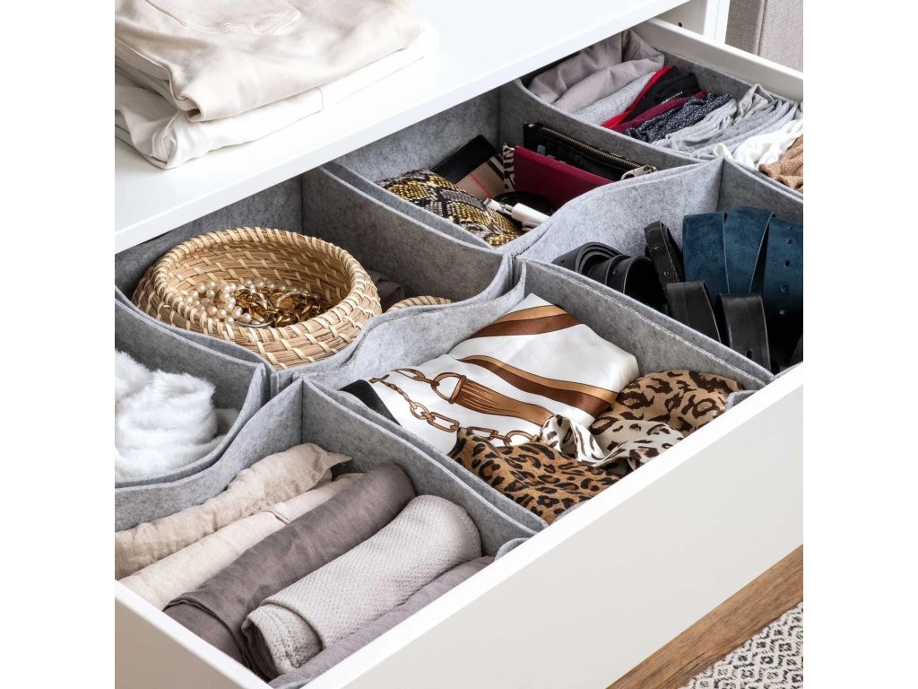 Snadná údržba a nadčasový design Péče o tyto organizéry je velmi snadná. V případě znečištění je lze jednoduše otřít vlhkým hadříkem, čímž se snadno odstraní nečistoty. Nadčasové šedé provedení se hladce začlení do každé zásuvky a šatníku, vytvářeje moderní a uspořádanou atmosféru.