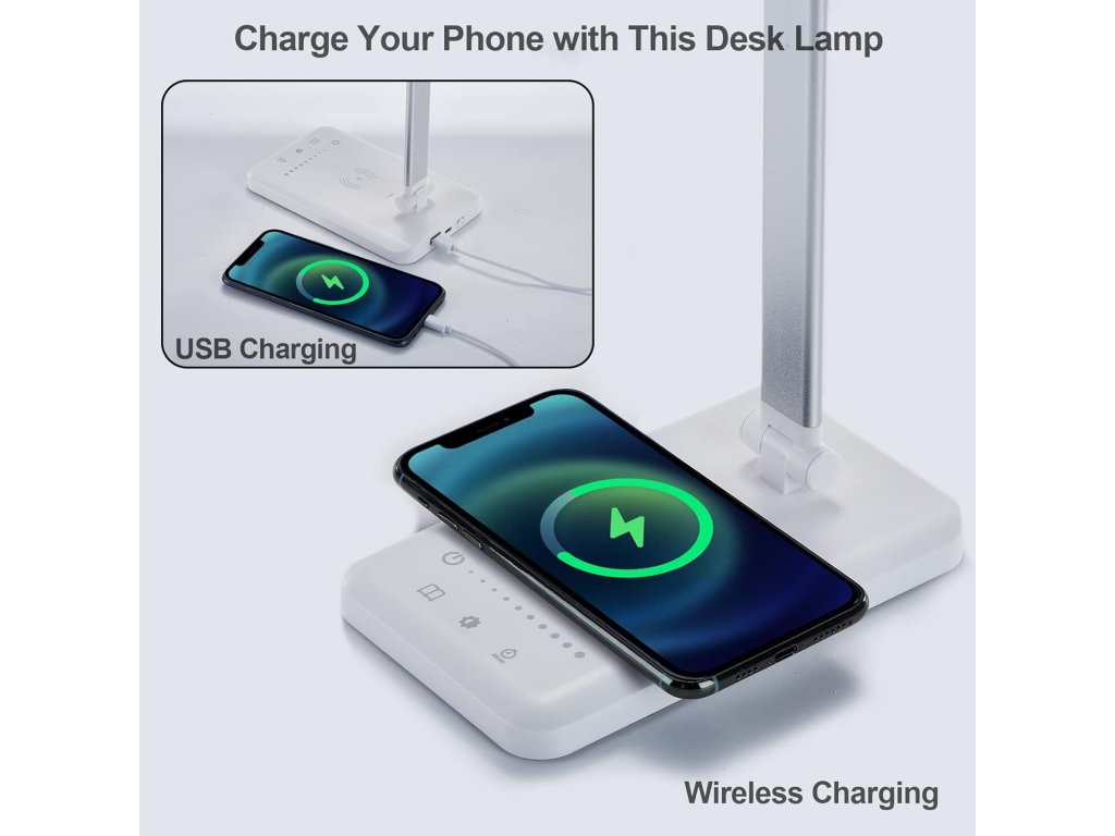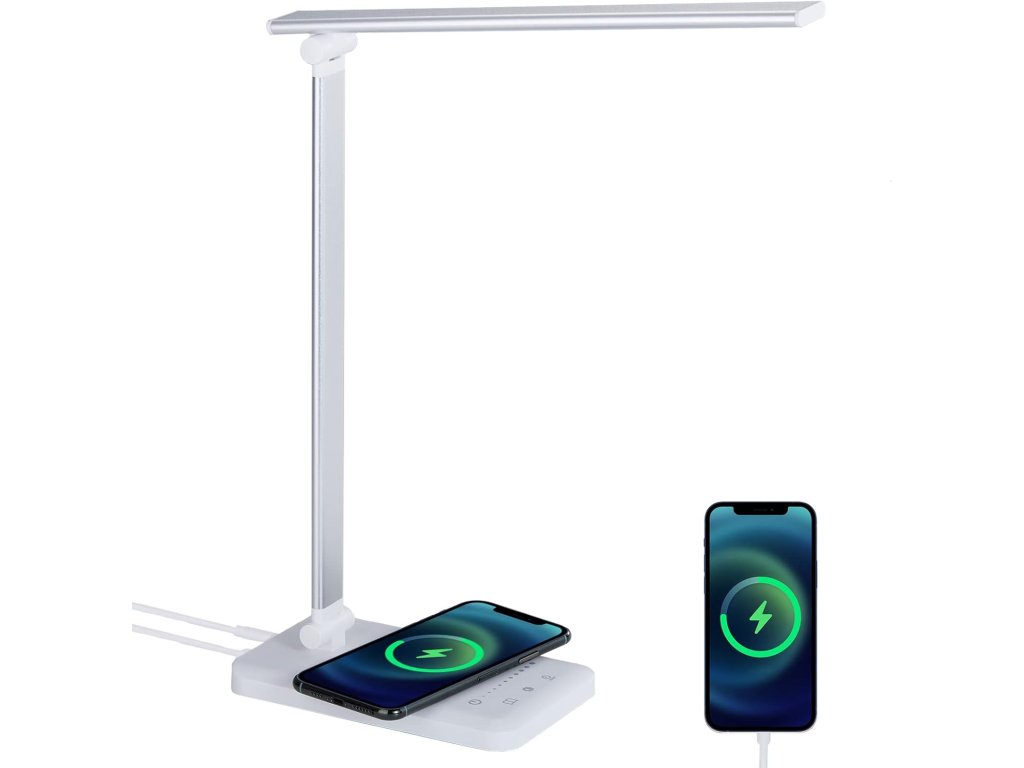 Osvětlovací těleso je vybaveno citlivým dotykovým ovládáním, které dovoluje rychlou volbu ideálního světelného režimu. Praktickou funkcí je vestavěné bezdrátové nabíjení pro mobilní telefony doplněné o klasický USB port, což umožňuje napájet zařízení přímo během používání lampy. Integrovaný časovač s automatickým vypnutím po 45 minutách zvyšuje komfort při usínání a šetří energii. Konstrukce s nastavitelnou hlavou a ramenem zajišťuje přesné nasměrování světelného toku dle aktuální potřeby. Skládací design usnadňuje přenášení a skladování, díky čemuž je svítidlo vhodné do kanceláří, ložnic i obývacích pokojů.