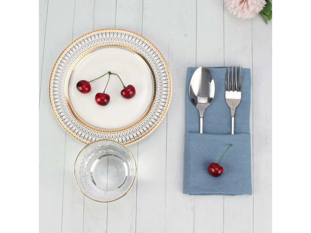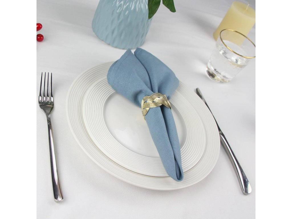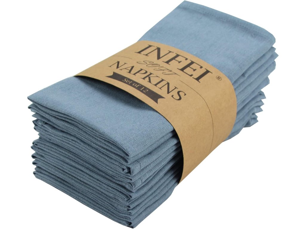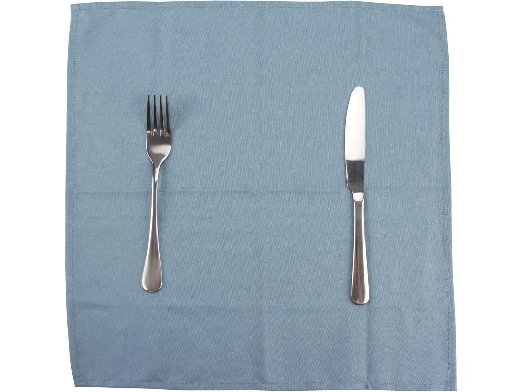 Sada 12 odolných a opakovaně použitelných látkových ubrousků (40 x 40 cm) ve vzdušně modré barvě z polyesterové lněné směsi. Odolné proti vráskám, ekonomické balení pro různé příležitosti.