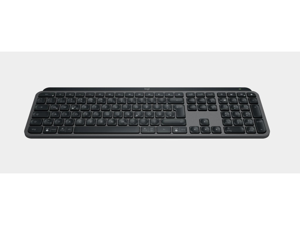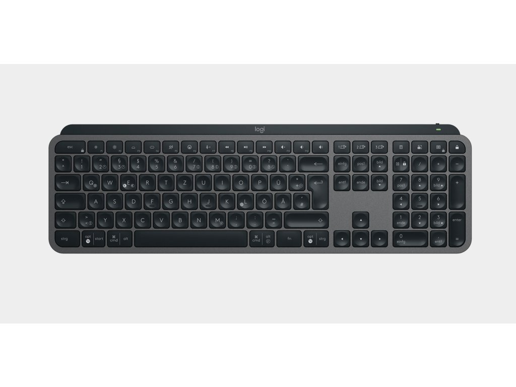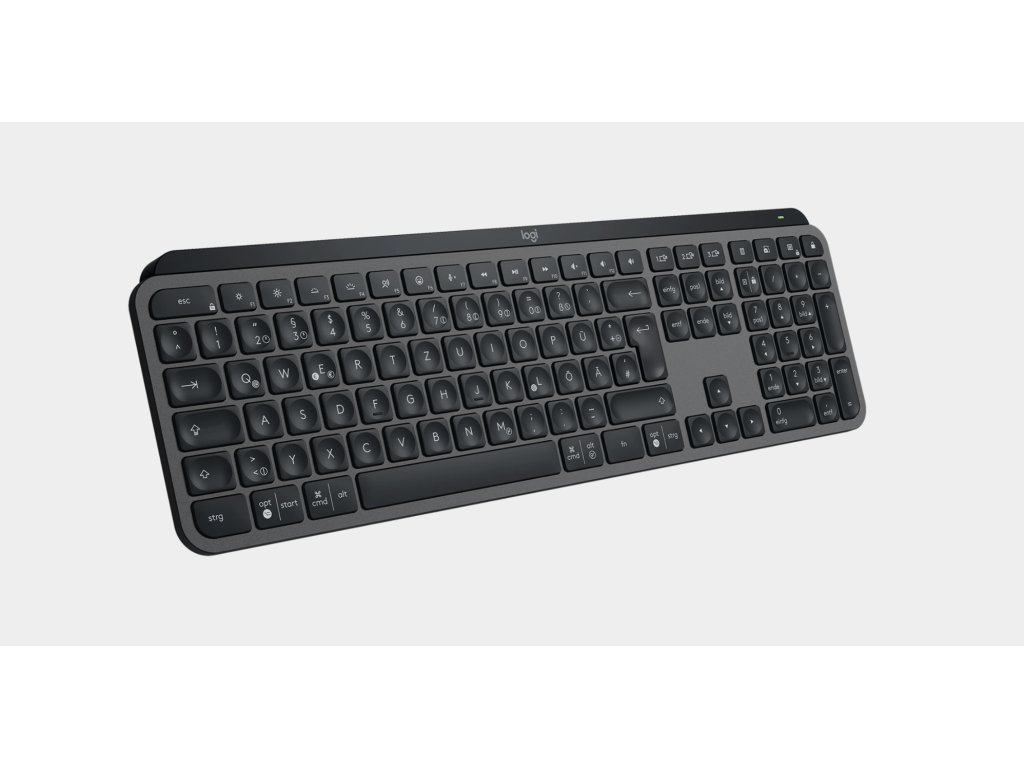Logitech MX Keys pro Mac - DE layout, bezdrátová Bluetooth klávesnice, podsvícená, nízkoprofilové klávesy, multimediální, šedá.
