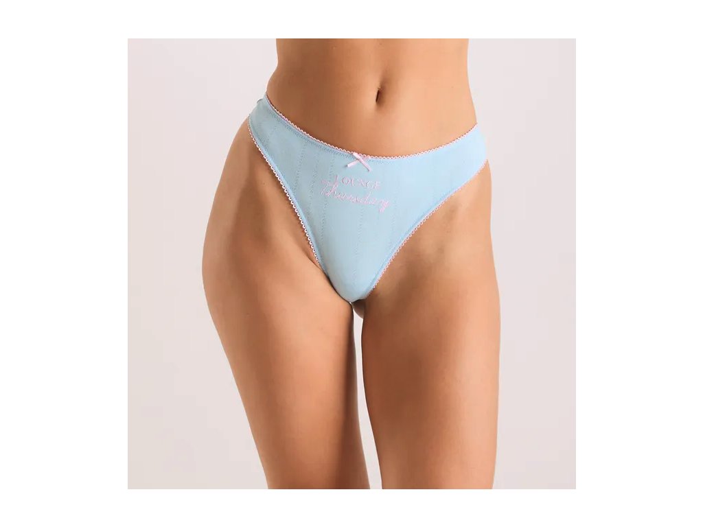 Sada kalhotek značky Lounge každý kus v tomto balení je vyroben z jemné dírkované pleteniny s vysokým podílem bambusového vlákna, které je známé svou přirozenou prodyšností a šetrností k pokožce. Kalhotky střihu tanga zdobí detailní výšivka s logem Lounge a názvem konkrétního dne v týdnu. Horní lem i výkroje jsou opatřeny jemným elastickým lemováním s ozdobným vlnkovým okrajem. Díky příměsi spandexu jsou kalhotky dostatečně pružné a skvěle se přizpůsobí postavě.