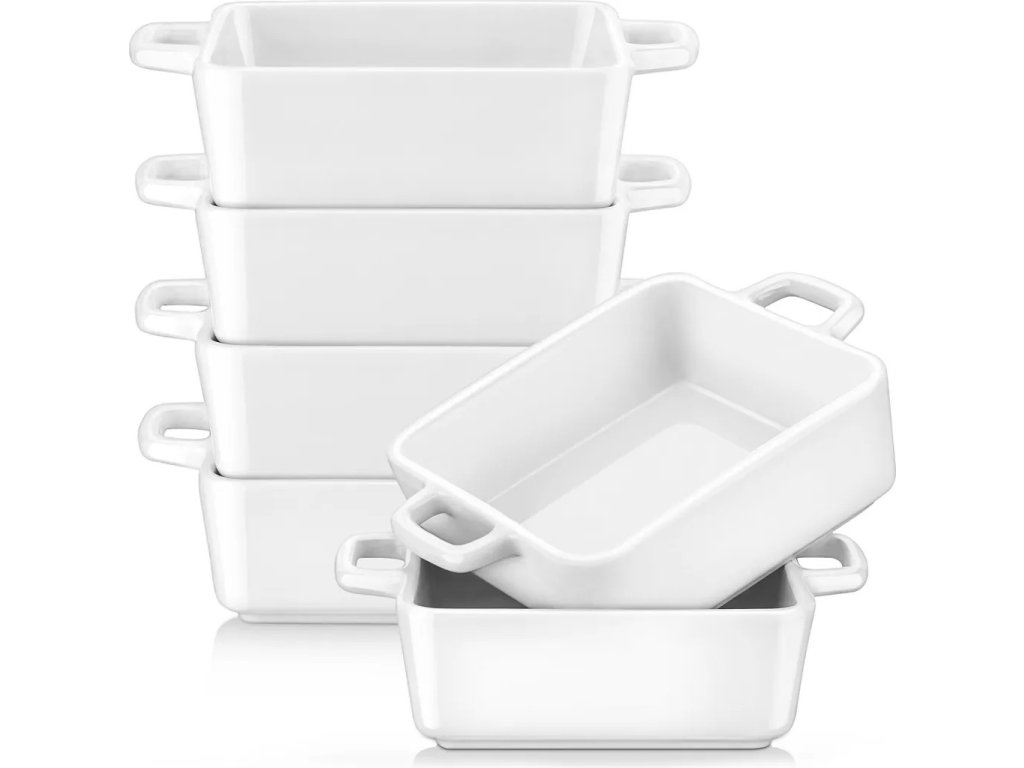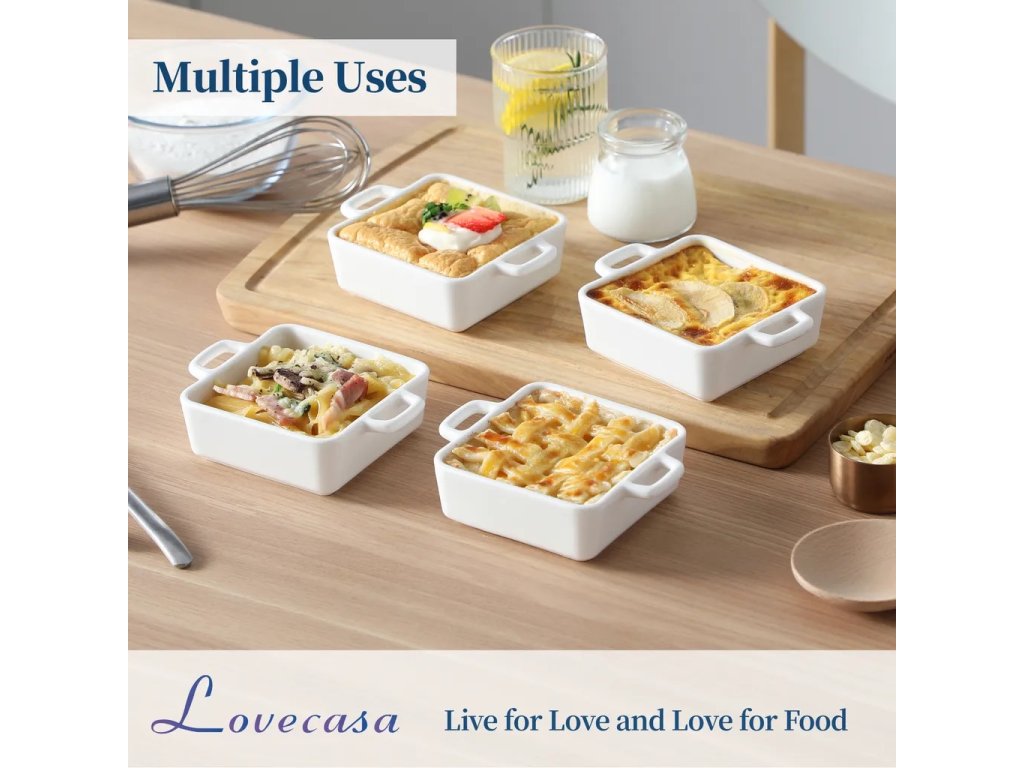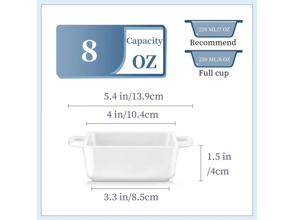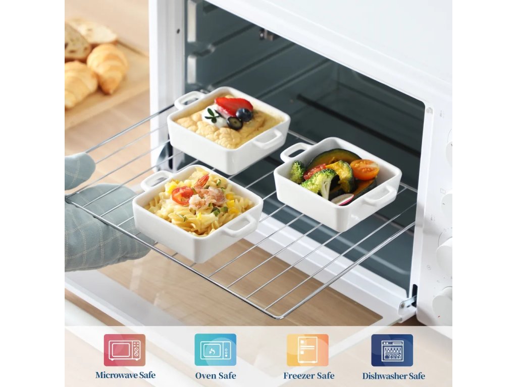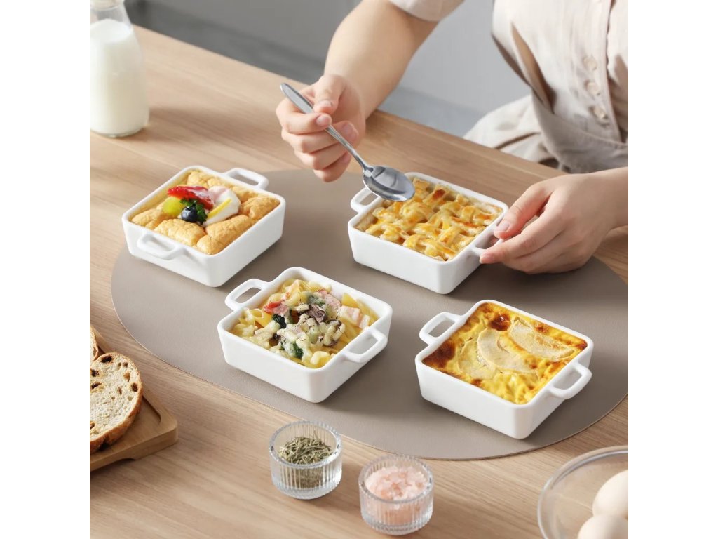Pohodlná a bezpečná manipulace: Ergonomické rukojeti zajišťují pohodlnou a bezpečnou manipulaci, usnadňují vyjmutí horkého pokrmu z trouby nebo mikrovlnné trouby. Hladký a bílý vnitřek ve čtvercovém tvaru dodává formičkám moderní vzhled.