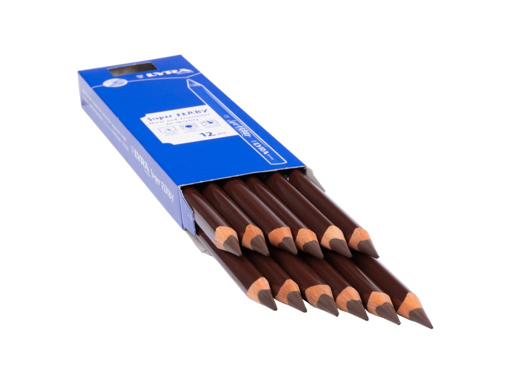 Pastelky LYRA Super Ferby se vyznačují silnými tuhy (o průměru 6,25 mm), které zaručují sytou a bohatou van Dyck hnědou barvu na papíře. Jejich ergonomický trojúhelníkový tvar podporuje správný úchop a zajišťuje komfortní kreslení i při dlouhodobé práci.