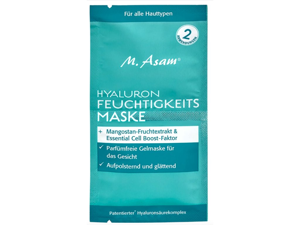 Hydratační maska Aqua Intense od značky M Asam s kyselinou hyaluronovou je speciálně vyvinuta pro suchou a citlivou pleť. Obsahuje extrakty z kdoule a mangostanu, které pleť chladí a osvěžují, a je bez parfemace.