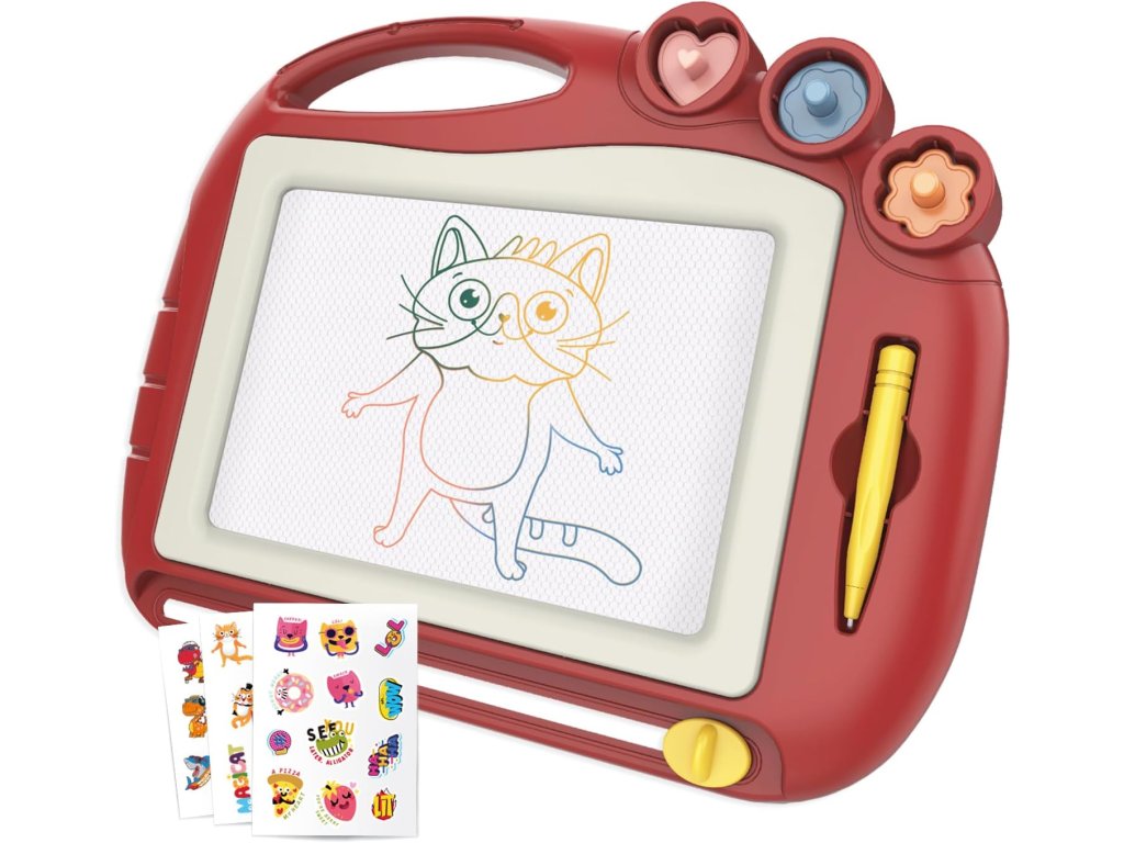 Magicat kouzelná kreslící tabulka 8.5 palců je kreativní magnetická tabulka se čtyřmi barevnými zónami (modrá, červená, žlutá, zelená), ideální pro děti od 3 let. Sada obsahuje 3 tematická razítka a samolepky pro rozvoj jemné motoriky a kreativity. Je kompaktní, lehká, vyrobená z BPA-free materiálu a skvělá na cesty.