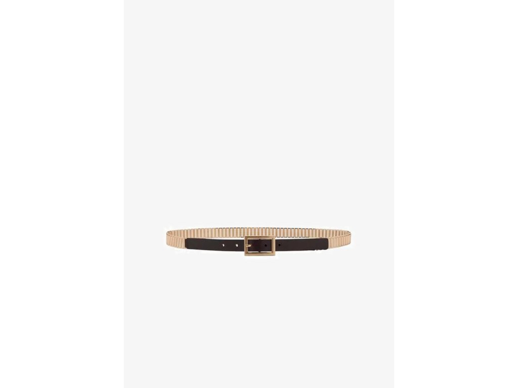 Tento pásek od značky Mango představuje módní doplněk, který se díky kombinaci materiálů a hnědé barvě hodí k různým outfitům.