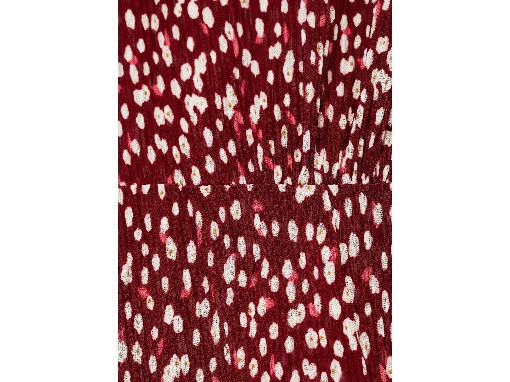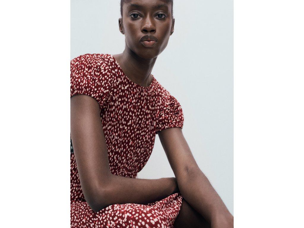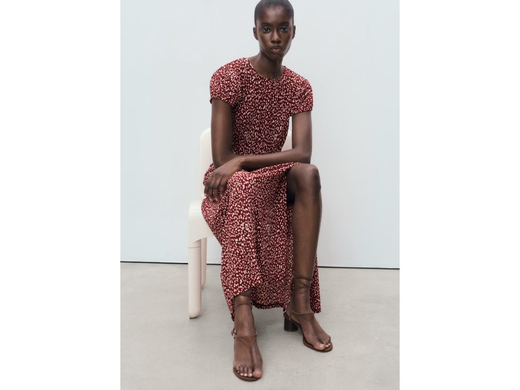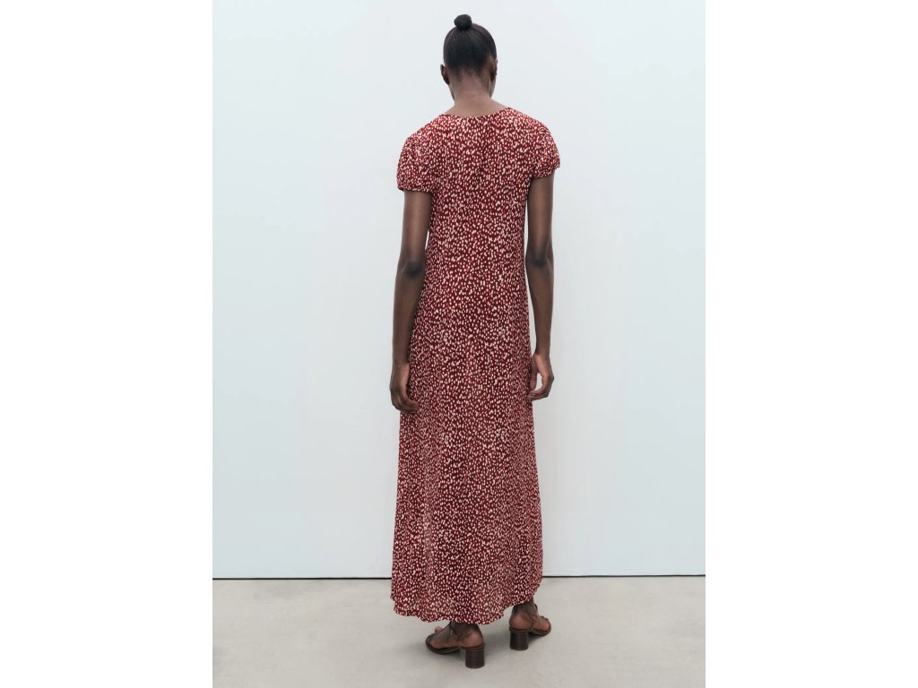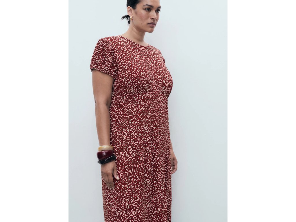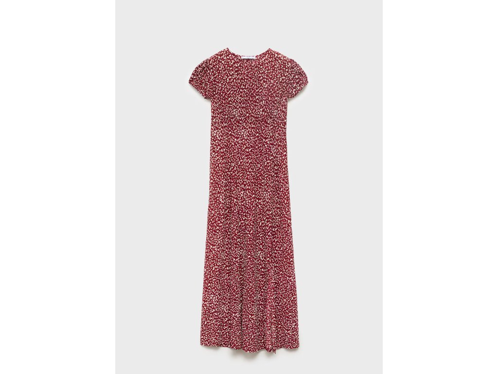 Model je doplněn květinovým potiskem, kulatým výstřihem a krátkými nabíranými rukávy, které dodávají šatům jemný a ženský vzhled. Praktickým detailem je boční rozparek, který zajišťuje větší volnost pohybu.