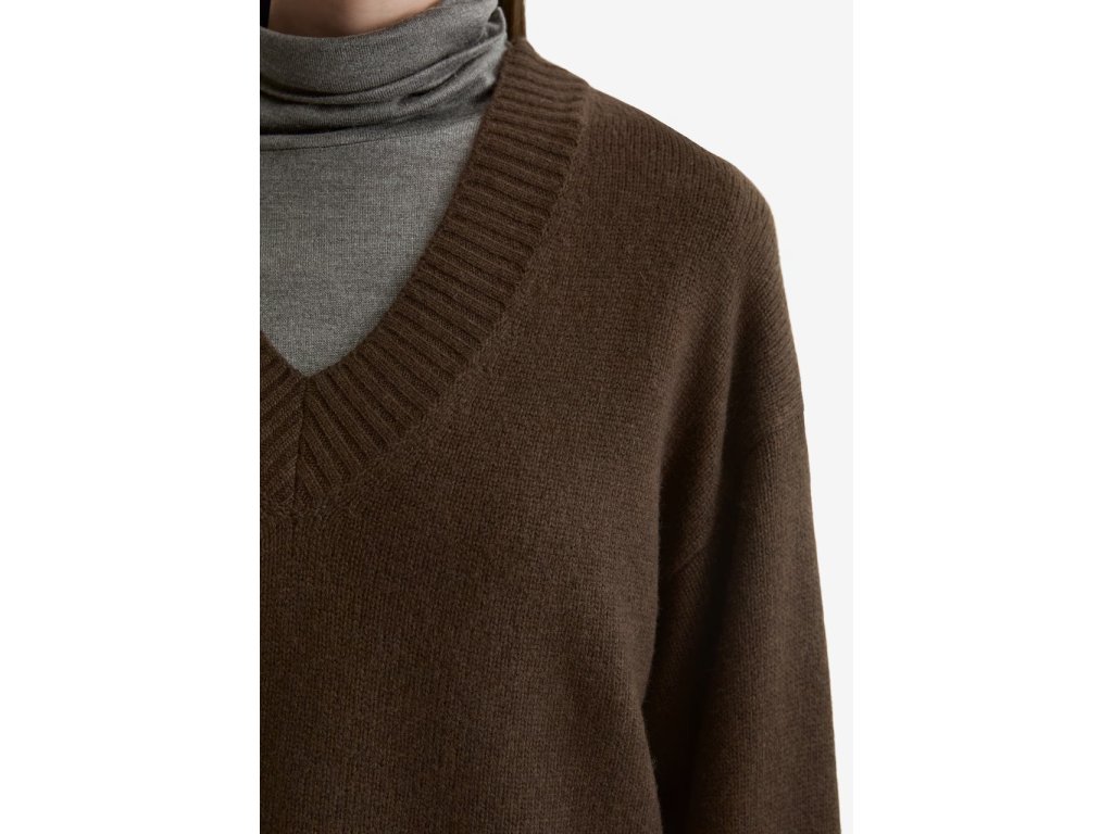 Model má výstřih do V, který působí elegantně a umožňuje snadné kombinování s košilí nebo tričkem. Spuštěná ramena a širší rukávy dodávají svetru moderní a uvolněný vzhled.