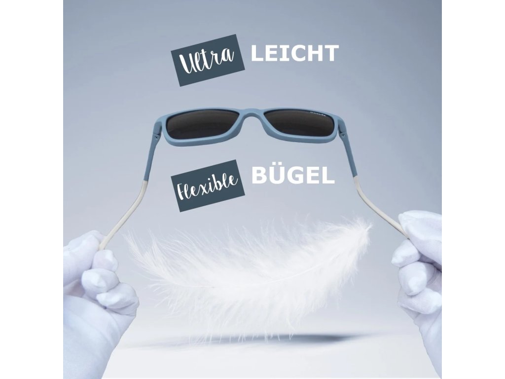 Brýle jsou vyrobeny z odolného polykarbonátu a mají flexibilní stranice, které jsou pevné a odolné. Čočky kategorie 3 z polykarbonátu poskytují 100% ochranu proti UV400 záření a splňují normy CE a ISO, takže si můžete být jisti, že jsou oči vašeho dítěte dobře chráněny. Brýle jsou dodávány v udržitelném kartonovém obalu s úložným sáčkem, který je vyroben z recyklovaného PET materiálu.