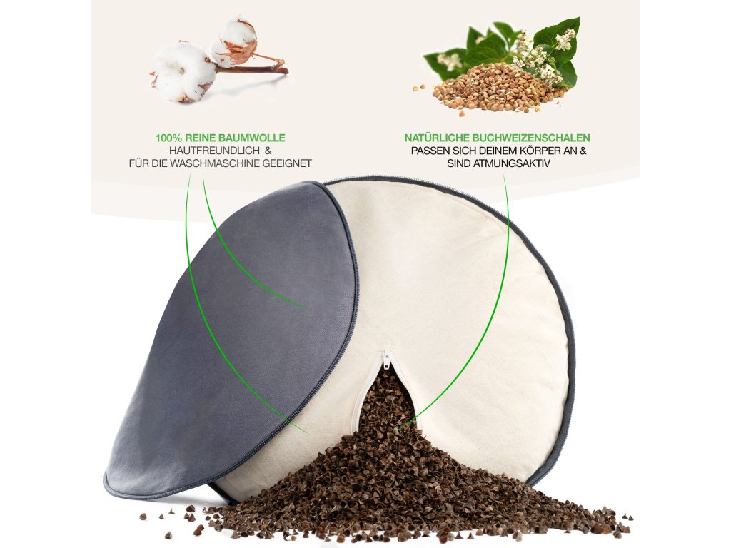 BACKLAxx® klade důraz na udržitelnost. Pohankové slupky jsou přírodním, prodyšným materiálem šetrným k pokožce a bez škodlivých látek. Obal polštáře je vyroben z biologicky odbouratelného kukuřičného škrobu.
