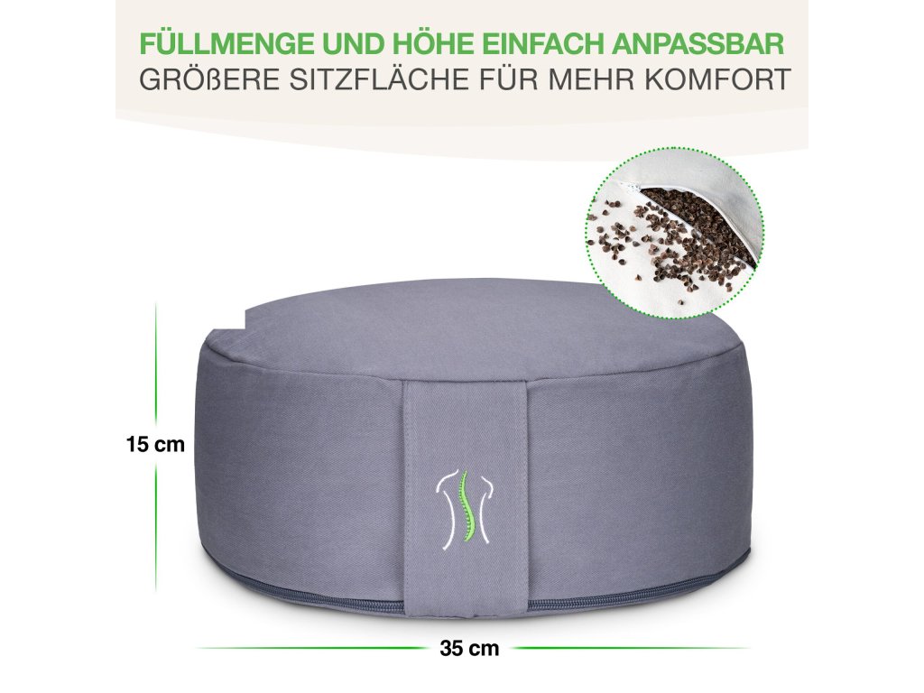 BACKLAxx® meditační polštář Ø35x15cm. Extra velká sedací plocha, pohankové slupky, pratelný potah, video kurz zdarma.