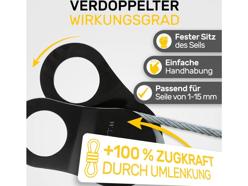 Robustní konstrukce a snadné použití: Kladka je vyrobena z pevné oceli pro vysoké zatížení, což zaručuje její mimořádnou robustnost a odolnost i v těch nejnáročnějších podmínkách. Pohyblivé kryty lze snadno otočit do strany, což usnadňuje vkládání lana (průměr 1-15 mm) a zabraňuje jeho vyklouznutí. Pojezdová drážka je úhledně zakončená a obsahuje zapuštěnou maznici pro snadné mazání, což prodlužuje životnost kladky.