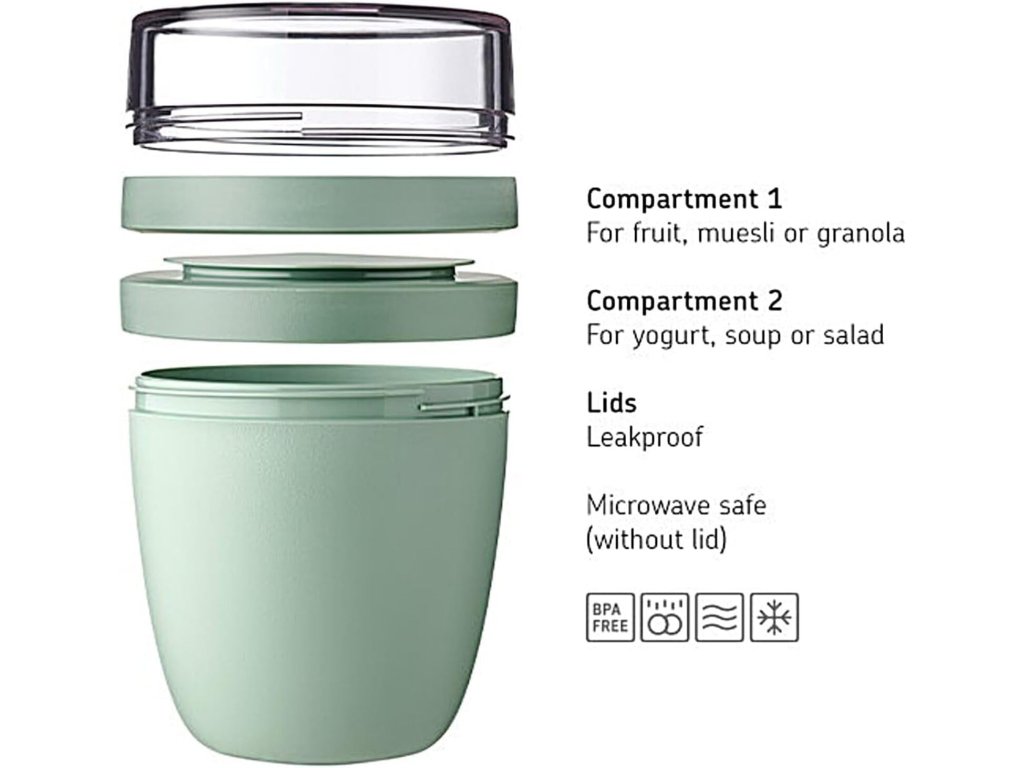 S dvoupatrovým kelímkem Soko si snadno připravíte a přenesete zdravou snídani. Nepropustné víčko udrží vaše ingredience čerstvé a oddělené – ovesné vločky ve spodní části a ovoce, ořechy či jogurt v horní. Součástí je lžička a přepážka pro snadné dávkování. Vhodný na ovesné kaše, jogurty, cereálie, saláty i smoothie. Vyroben z kvalitního potravinářského polypropylenu, bezpečný a odolný. Rozměry: 10.7 x 10 x 15.1 cm, hmotnost: 250 g.