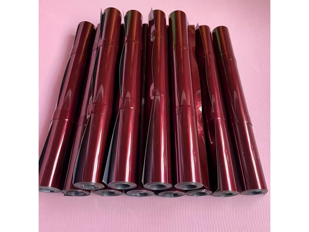 Materiál a efekt: Metalický film obsahuje červené barvivo a má speciální úpravu která umožňuje změnu barvy v závislosti na úhlu pohledu.