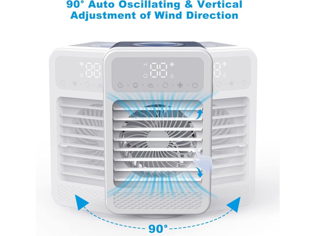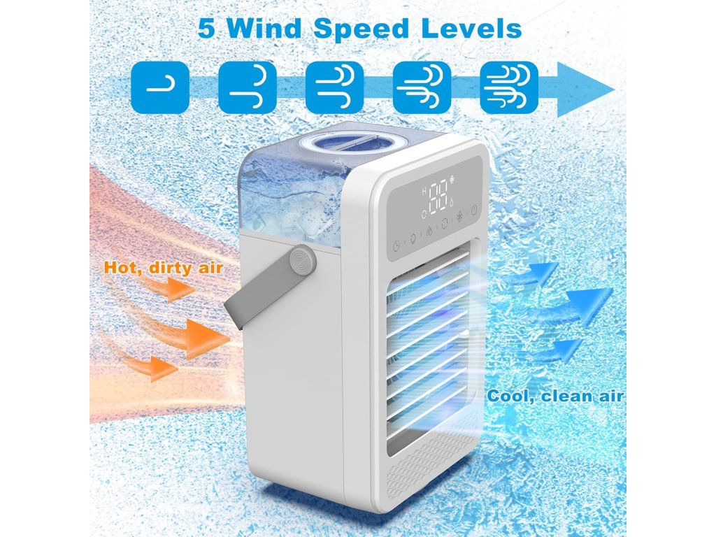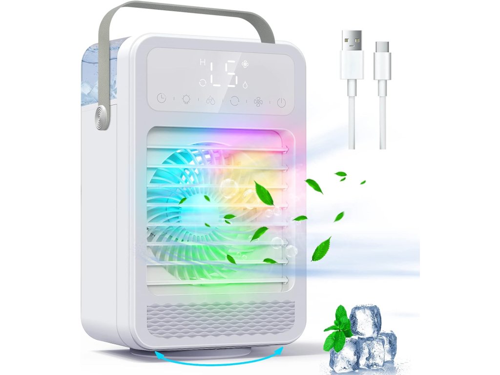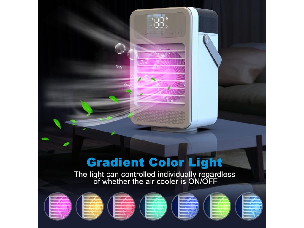 Malý a tichý ochlazovač vzduchu s 5 rychlostmi, otáčením a barevným světlem. Funguje i jako zvlhčovač a má časovač. Ideální na tvůj stůl!