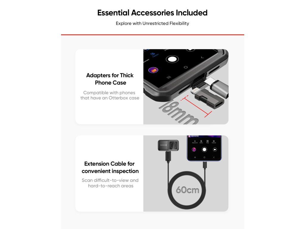 Obsah balení: termokamera Mini2 V2, USB-C/Lightning adaptér, prodlužovací kabel 60 cm, EVA pouzdro a rychlý průvodce.