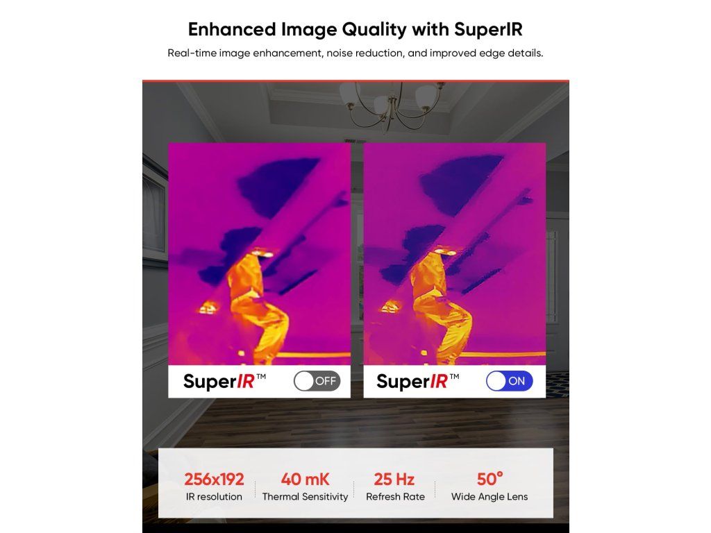 Termokamera Mini2 V2 přináší kvalitní termální zobrazení díky IR rozlišení 256 × 192 px a technologii SuperIR, která pomáhá potlačovat šum a zvýraznit jemné detaily. Díky obnovovací frekvenci 25 Hz je obraz plynulý a dobře použitelný i při rychlejší práci.