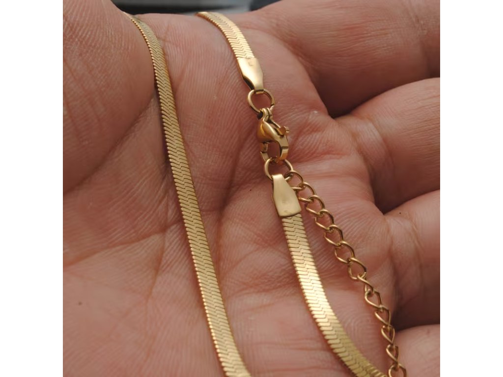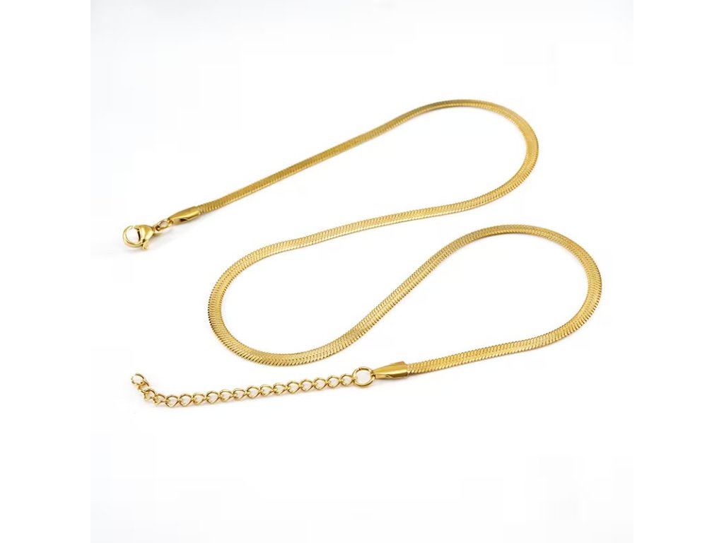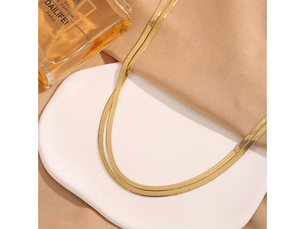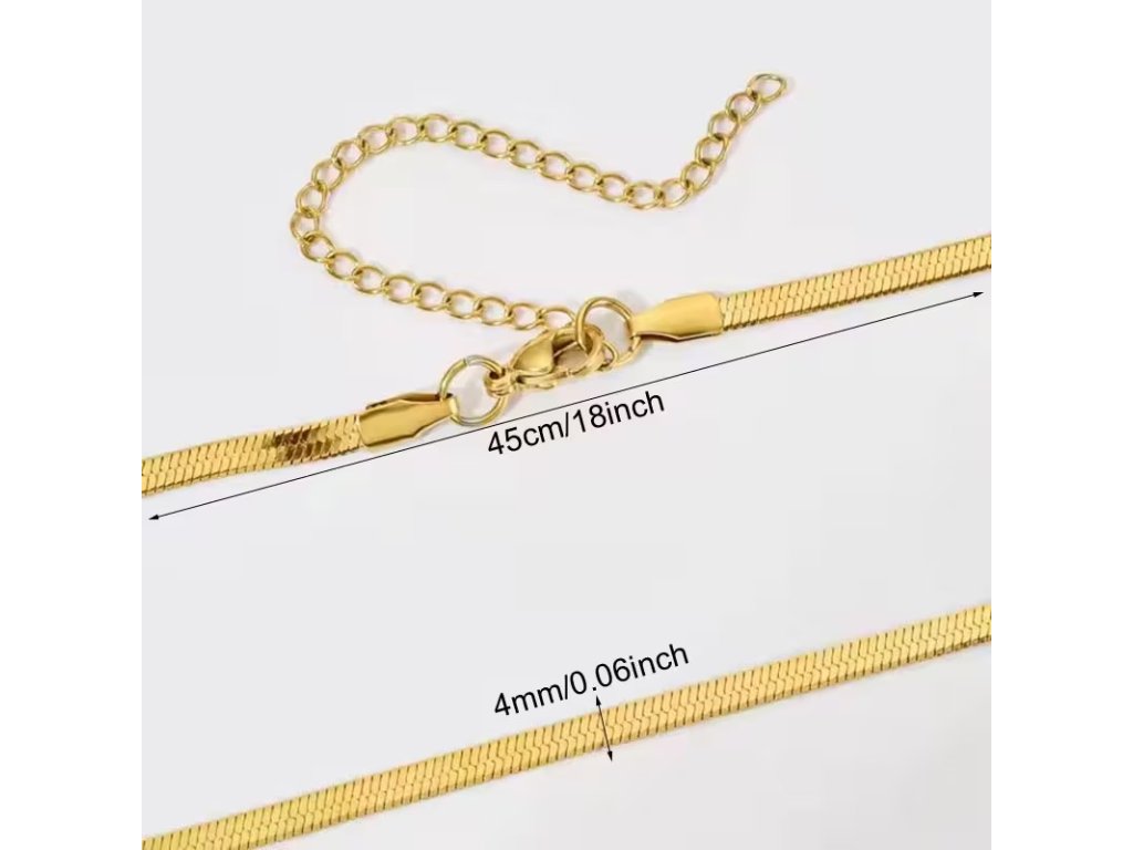 Náhrdelník kombinuje minimalistickou eleganci s nádechem luxusního vintage stylu. Jeho konstrukce se skládá z plochého vzoru připomínajícího rybí kost (herringbone) doplněného o jemnou hadí řetízkovou linku. Díky preciznímu zpracování a kvalitním materiálům se tento kousek vyznačuje vysokou odolností vůči vnějším vlivům, což zaručuje, že zlatý povrch nevybledne a zachová si svůj reprezentativní vzhled po dlouhou dobu.
