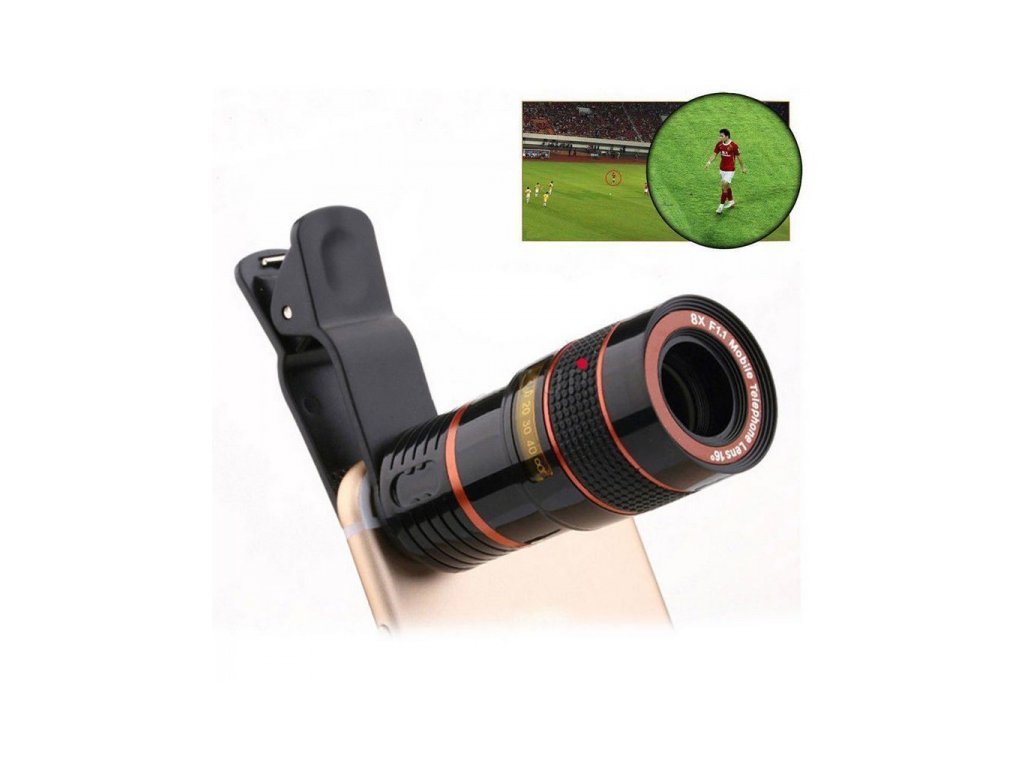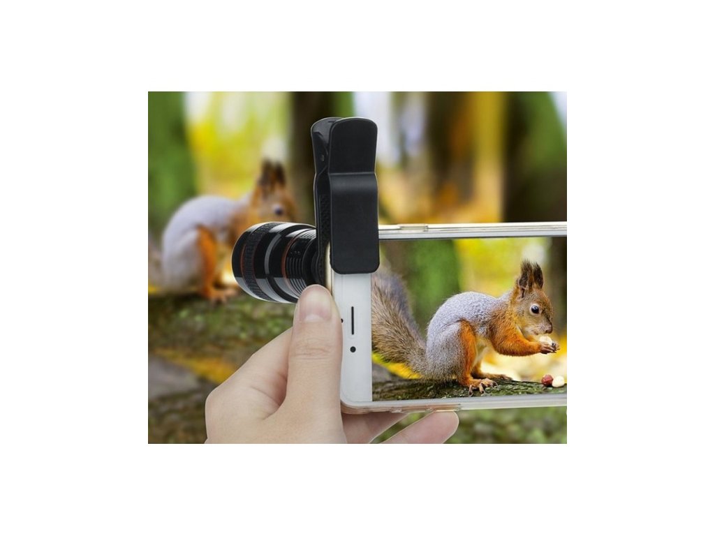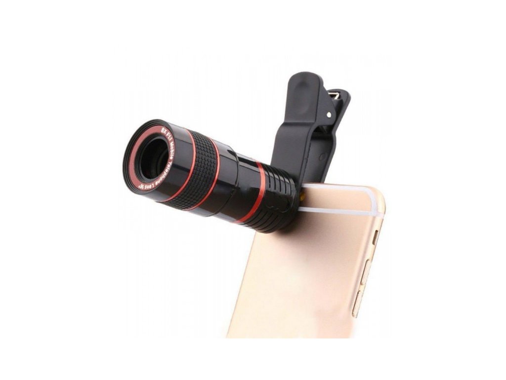 Mobilní objektiv s 8x optickým zoomem je ideální doplněk pro váš telefon či tablet, který vám umožní fotografovat vzdálené objekty s jasným a detailním obrazem. Objektiv v černé barvě se snadno připevňuje pomocí univerzálního klipu s ochrannou gumou. Součástí balení jsou také krytky a utěrka na optiku.