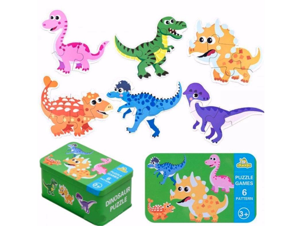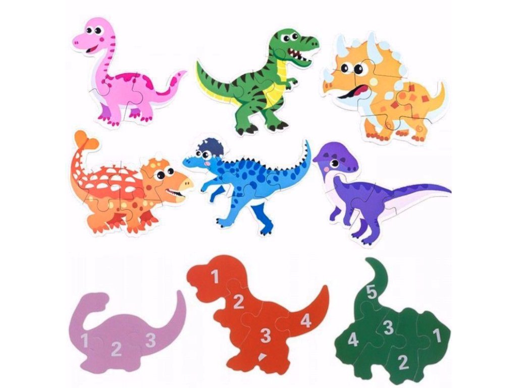 První puzzle s motivem dinosaurů jsou ideální volbou pro rozvoj dětské představivosti a manuální zručnosti. Sada obsahuje celkem 27 dílků, ze kterých lze složit 6 různých druhů pravěkých zvířat. Jednotlivé prvky jsou vyrobeny z velmi silného a odolného kartonu, který je přizpůsoben malým dětským rukám pro snadnou manipulaci a skládání. Živé barvy a atraktivní ilustrace motivují děti k soustředěné hře a pomáhají jim učit se rozpoznávat základní tvary a barvy.