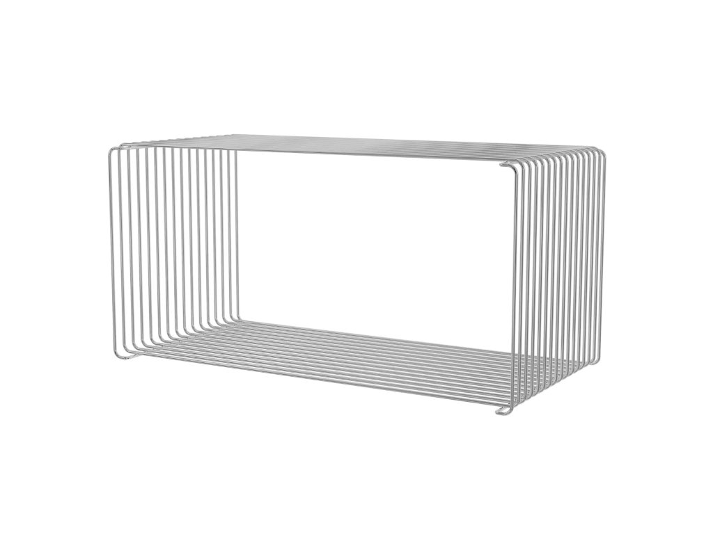 Ikonický policový díl Montana Panton Wire Extended Chrome, design Verner Panton z roku 1971. Nadčasová chromovaná konstrukce z 5mm ocelového drátu kombinuje industriální vzhled s lehkostí a modularitou. Lze použít samostatně, zavěsit na zeď nebo spojovat do větších sestav pomocí klipů (součástí balení). Možnost doplnění o skleněnou či mramorovou desku. Rozměry: šířka 70 cm, výška 34.8 cm, hloubka 34.8 cm. Nosnost 40 kg na zemi, 10 kg na zdi. Součástí balení jsou ochranné podložky, spojovací klipy, hmoždinky a šroubky. Vyrobeno z pochromovaného kovu s certifikací Ecolabel. Pro moduly vyšší než 70 cm je nutné připevnění ke zdi bezpečnostním páskem. Ideální pro moderní a minimalistické interiéry.