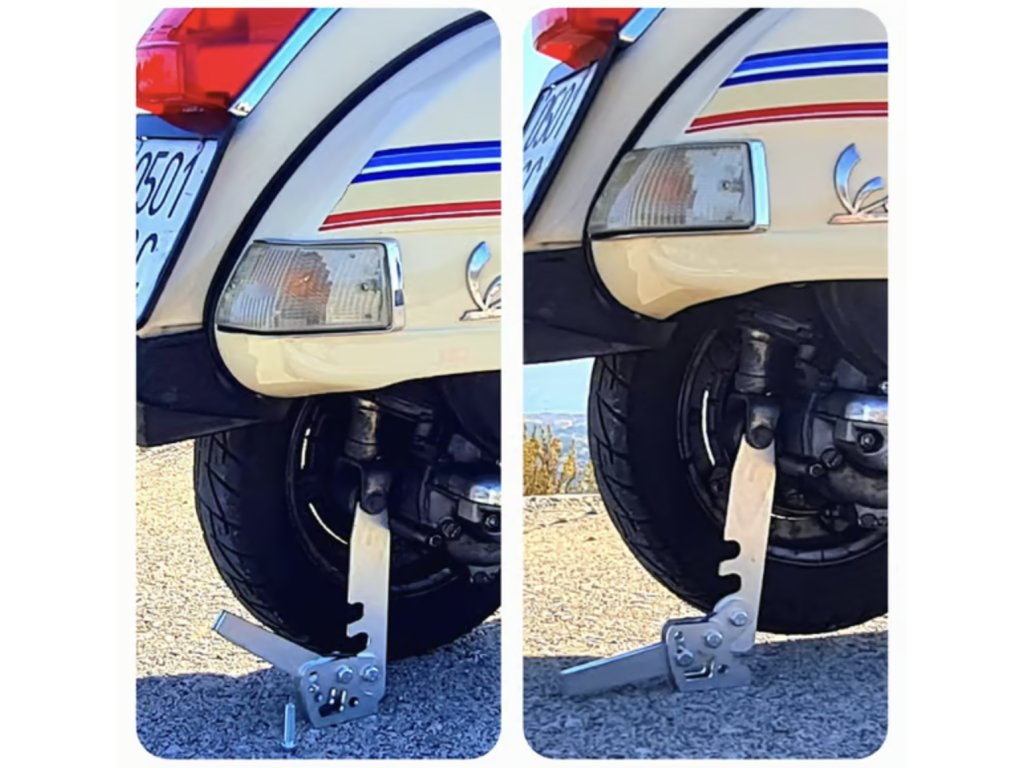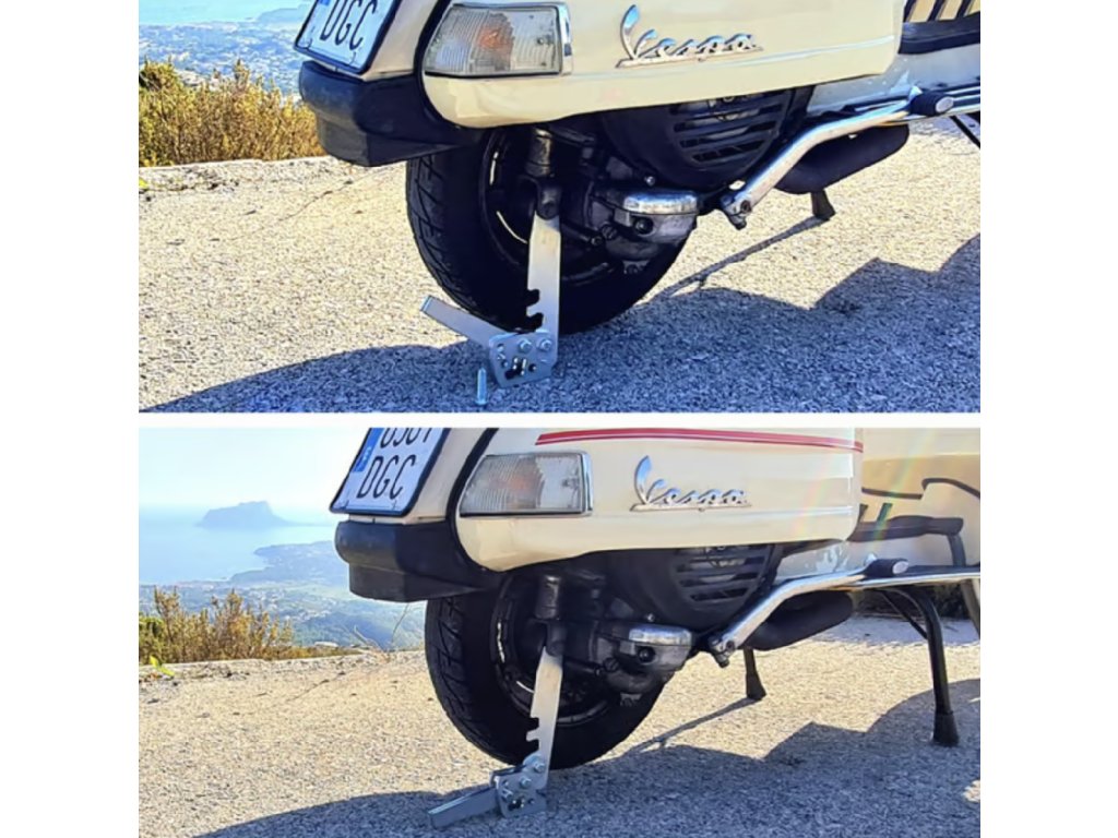 S tímto stojanem lze skútr Vespa bezpečně zvednout a zadní kolo demontovat v několika jednoduchých krocích. To je neocenitelné při výměně defektní pneumatiky nebo brzdových destiček. Díky kompaktním rozměrům a nízké hmotnosti se stojan snadno vejde do jakéhokoli zavazadlového prostoru.