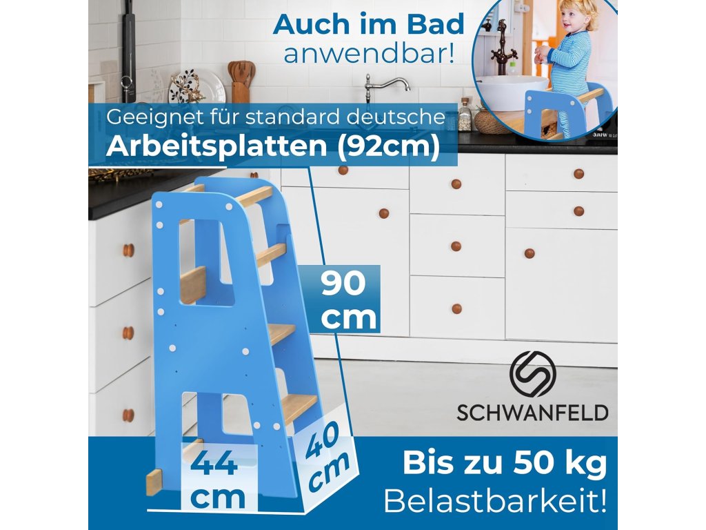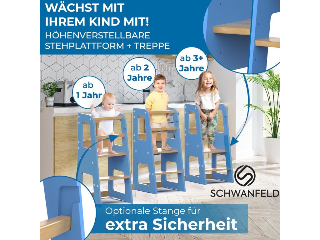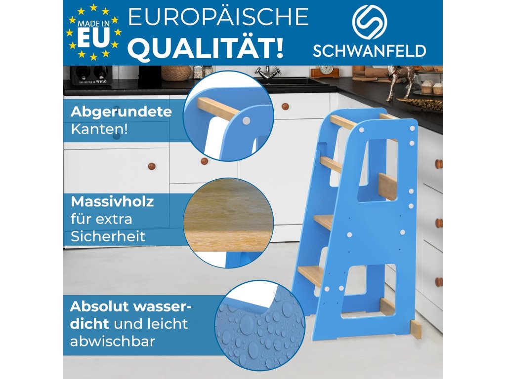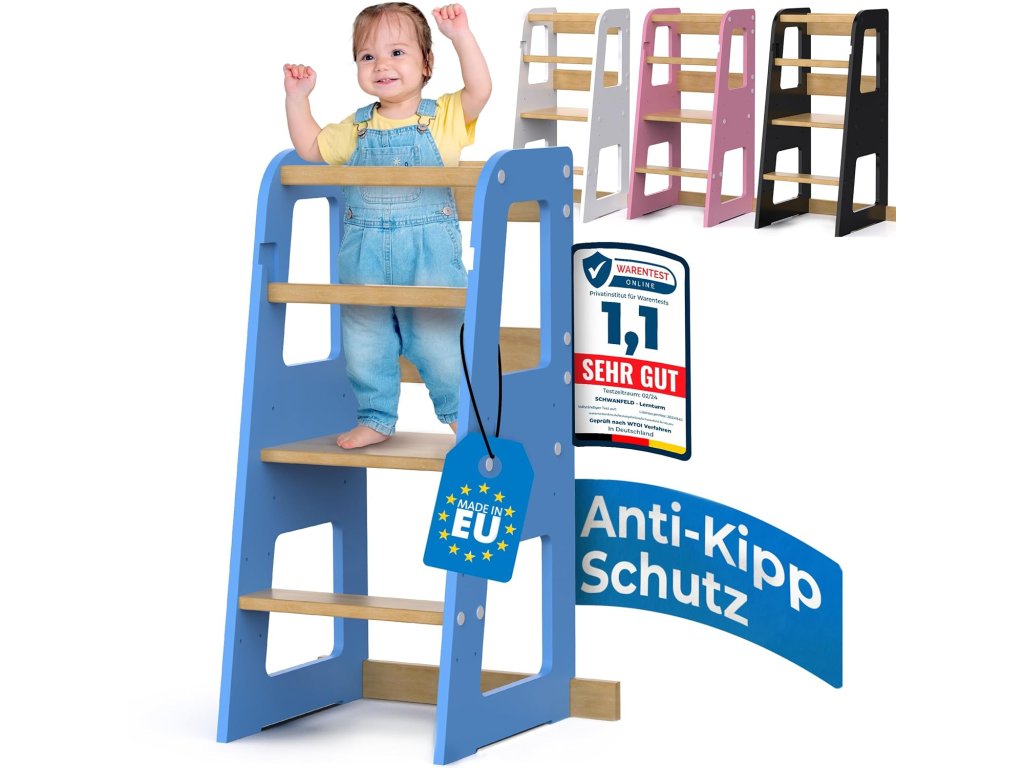 Velkou výhodou je variabilita nastavení. Schůdky i samotná plošina na stání jsou výškově nastavitelné do tří úrovní, takže věž roste společně s dítětem a může sloužit i dalším sourozencům. Povrch je opatřen certifikovaným, voděodolným lakem, který je zcela bezpečný pro děti. Úprava umožňuje snadné čištění vlhkým hadříkem, což je při dětských aktivitách nezbytné.