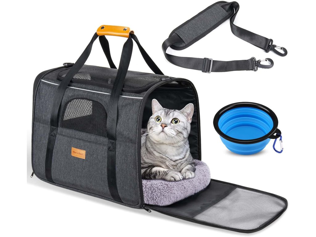 Praktická a přenosná: S rozměry 44 x 31 x 34 cm je tato taška doporučena pro domácí mazlíčky do 6,8 kg (15 lbs). Před nákupem prosím změřte svého mazlíčka a ponechte mu dostatek prostoru pro pohodlí. Součástí balení je také skládací modrá miska a měkký polštářek pro extra komfort.