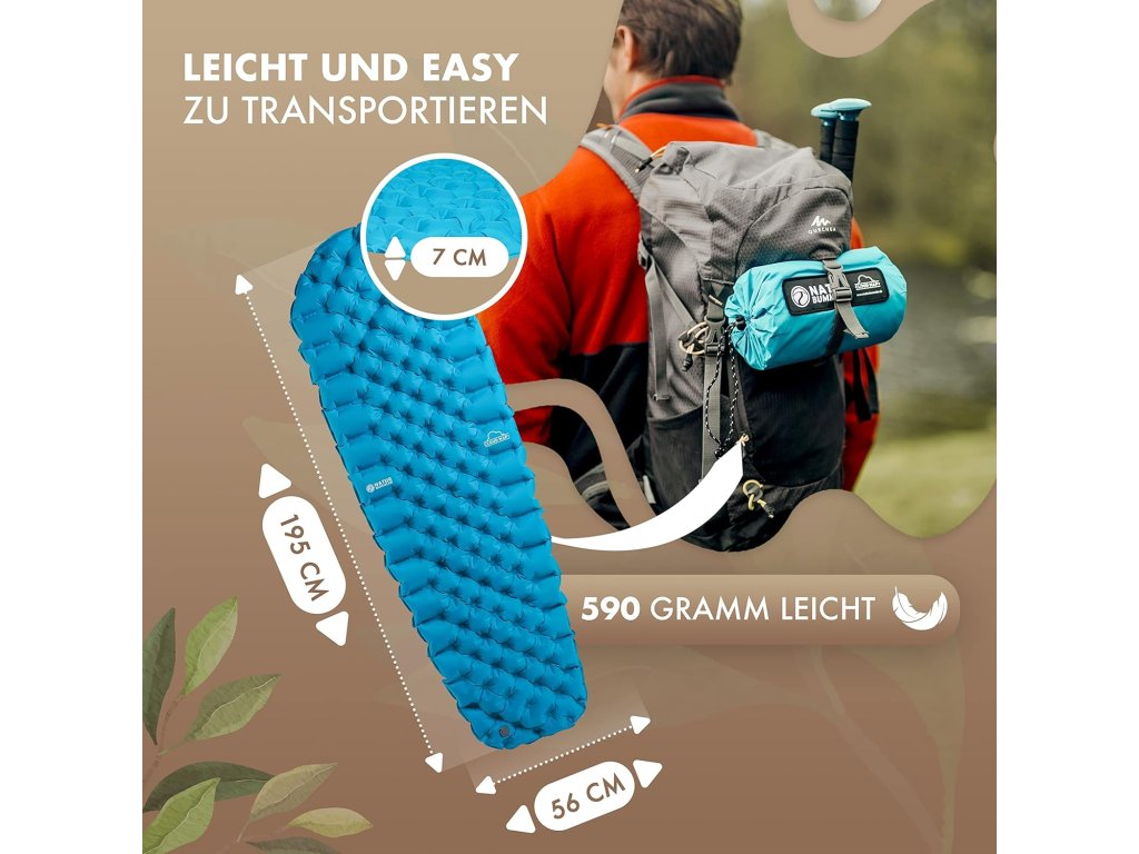 Nafukovací karimatka Naturbummler® Cloud Map+ o rozměrech 195 x 56 cm je ideální pro trekking, kempování a cestování.