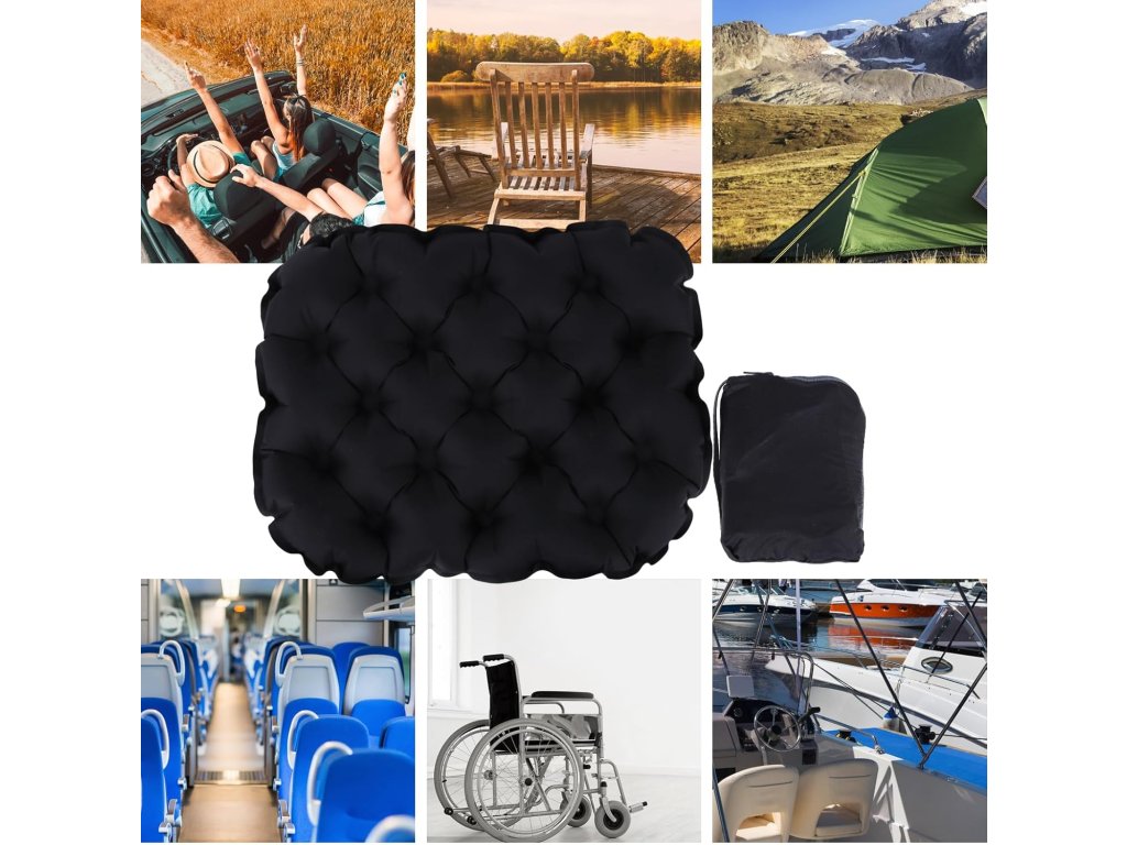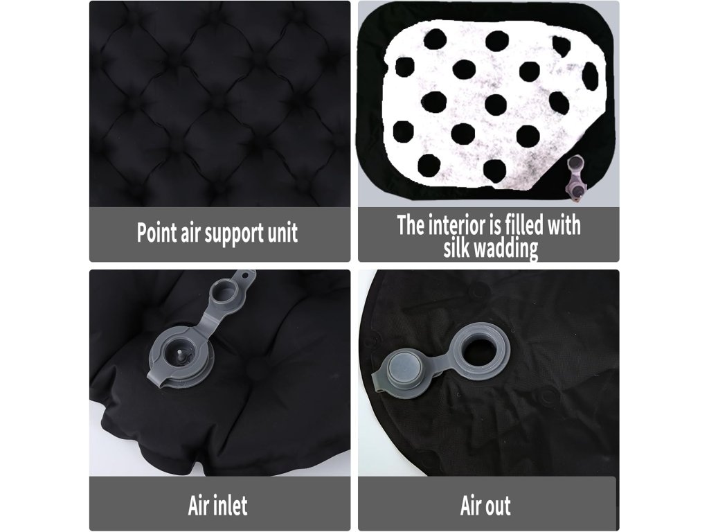 Tato přenosná nafukovací podložka Fadcaer v černé barvě je ideální pro kempování nebo cestování. Podložka, která má po nafouknutí rozměry 40 x 30 cm, poskytuje rovnoměrnou podporu a je vyplněna hedvábnou bavlnou, která udržuje teplo. Díky robustnímu nylonovému materiálu TPU je odolná proti vlhkosti a vodě.