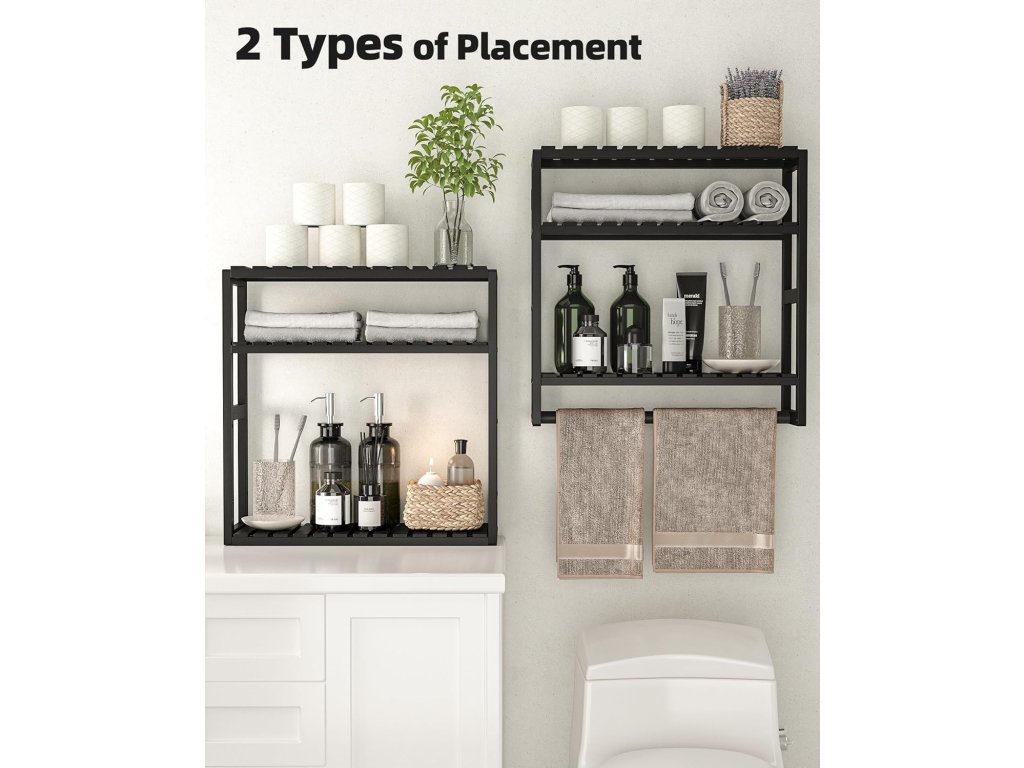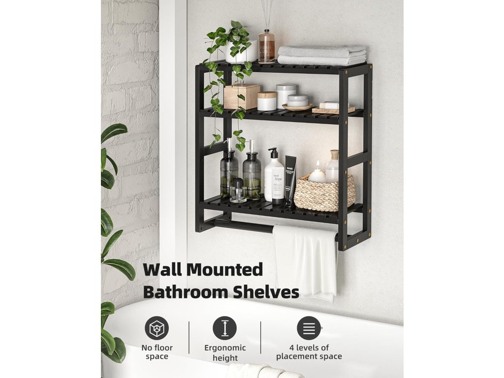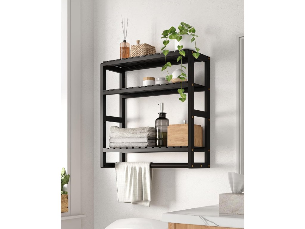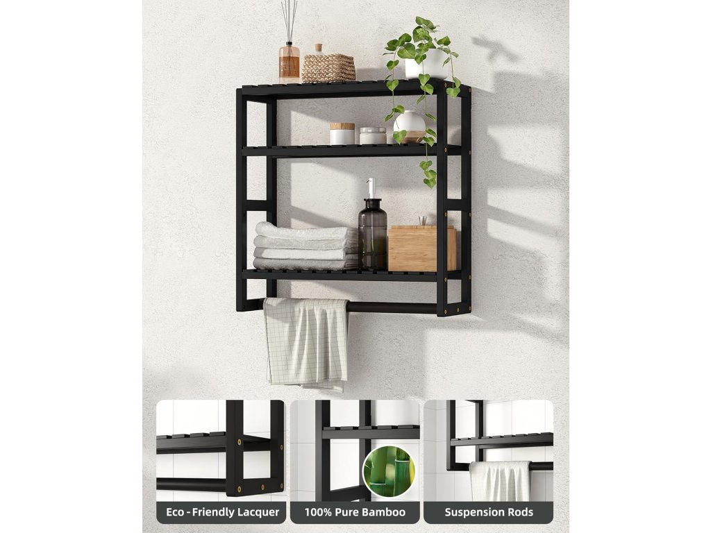 Prostorově úsporná 3patrová nástěnná police nad toaletu s bambusovým držákem na ručníky a závěsnou tyčí. Ideální pro organizaci koupelny.