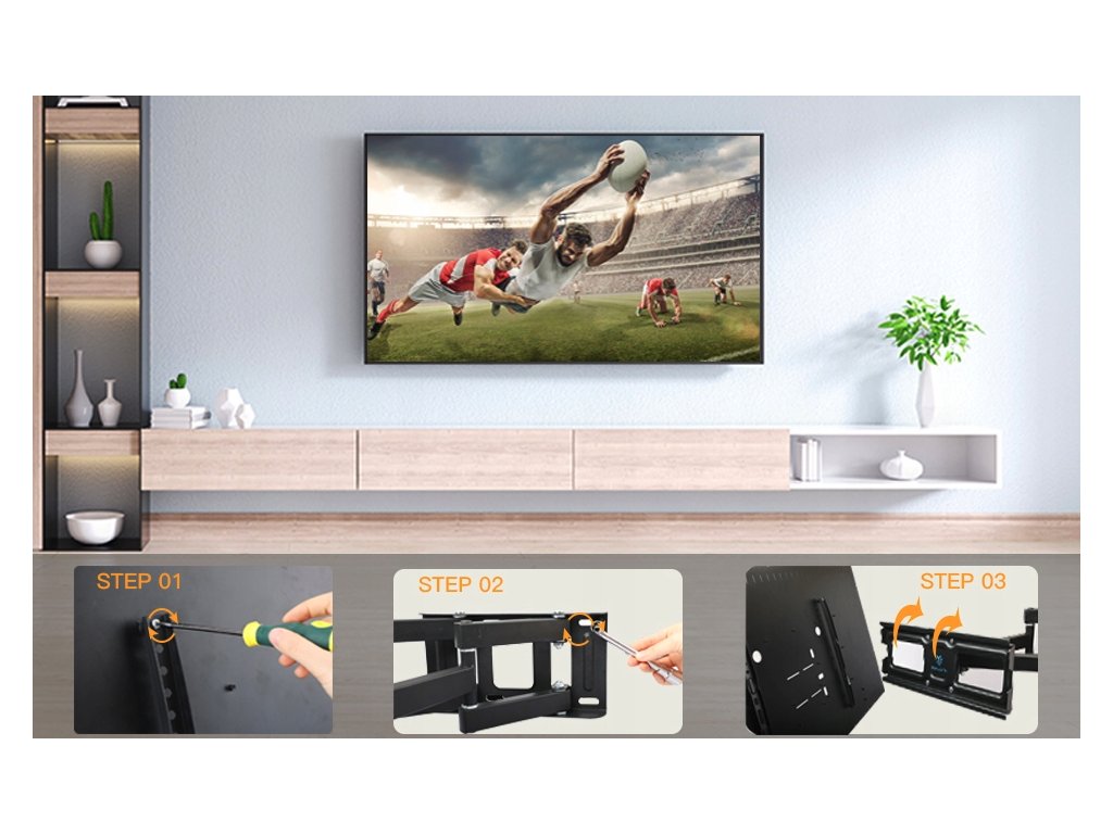 Tento držák je vhodný pro ploché i prohnuté televizory a podporuje standard VESA až do 400x400 mm. Je vyroben z kvalitní oceli a hliníku a byl testován na čtyřnásobek doporučené hmotnosti. Umožňuje naklonění v rozmezí +5° až -12°, otáčení v rozsahu +/- 45° a nastavení úrovně +/-3° pro maximální flexibilitu. Jeho dvě ramena se zasunou na vzdálenost pouhých 8 cm od stěny a lze je vysunout až do 41 cm. Instalace je snadná a v balení najdete veškeré potřebné vybavení.