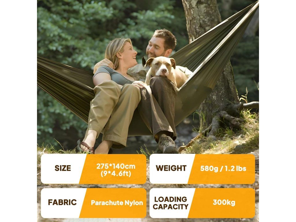 Houpací síť je vyrobena z vojenského padákového nylonu 210T s trojitým prošíváním. Váží pouhých 580 g (včetně dvou karabin a popruhů). Má rozměry 275 x 140 cm a lze ji sbalit do malého vaku o rozměrech 18 x 13 cm. Díky přiloženým 2 metrů dlouhým popruhům a karabinám je instalace snadná a rychlá. Je ideální na kempování, turistiku nebo odpočinek na zahradě.