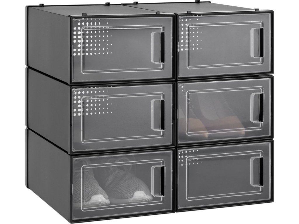 Zbavte se chaosu ve vaší obuvi s praktickou sadou 6 stohovatelných botníků Navaris! Tyto průhledné úložné boxy v elegantní černé barvě vám pomohou uspořádat vaši sbírku bot a udržet přehled. Do každého boxu se pohodlně vejde jeden pár bot až do velikosti 43, a to včetně tenisek, balerín i bot na vysokém podpatku.Botníky jsou vyrobeny z pevného a voděodolného plastu, což zajišťuje jejich stabilitu a dlouhou životnost. Díky průhlednému designu snadno a rychle najdete požadovaný pár bot, aniž byste museli otevírat všechny krabice. Můžete je umístit vedle sebe nebo je bezpečně stohovat a ušetřit tak cenné místo ve vaší předsíni, šatně či ložnici.