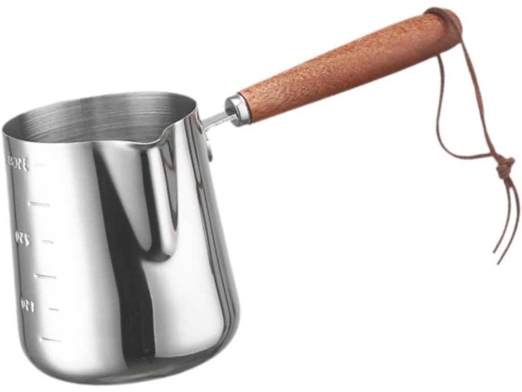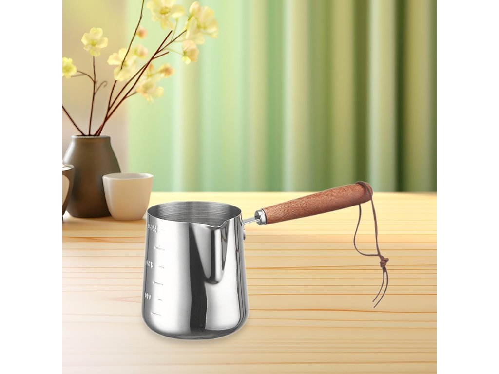 Konvička na kávu a mléko kombinuje funkčnost s elegantním vzhledem. Použitá nerezová ocel typu 201 zaručuje dlouhou životnost a odolnost při každodenním používání. Výrazným prvkem je ergonomická dřevěná rukojeť, která nejen dobře vypadá, ale především chrání před popálením a zajišťuje stabilní úchop při manipulaci. Speciálně tvarovaná výlevka umožňuje precizní nalévání, což oceníte zejména při tvorbě mléčných obrazců v kávě.