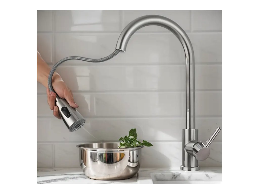 Tato nerezová kuchyňská baterie má moderní design a vytahovací spršku, která se otáčí o 360°. Nabízí dvoustupňovou regulaci průtoku vody a snadno se čistí.