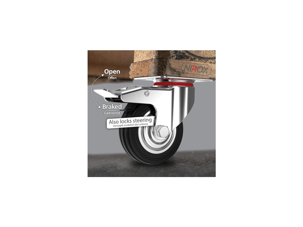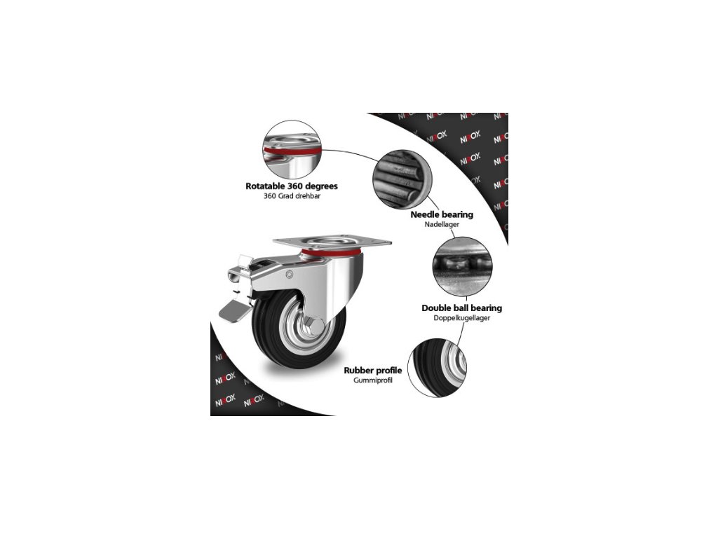 Sada 4 otočných koleček Nirox pro vysokou zátěž s průměrem 75 mm je určena pro vnitřní i venkovní použití. Kolečka jsou vyrobena z plné gumy a uložena v robustním pozinkovaném ocelovém pouzdře. Každé kolečko má nosnost 50 kg, což znamená celkovou nosnost sady až 200 kg. Všechna kolečka jsou otočná o 360 stupňů a dvě z nich jsou vybavena brzdou. Celková výška koleček je 95 mm.