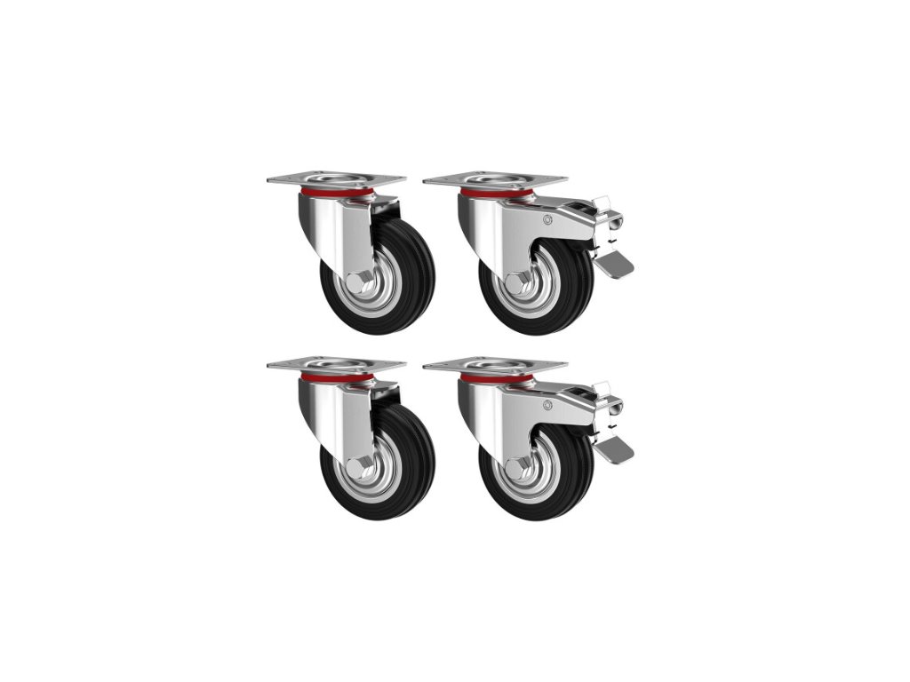 Konstrukce a materiál Kolečka z plné gumy: Zajišťují tichý chod a dobrou přilnavost na různých površích. Pouzdro válečků: Vyrobeno z robustní pozinkované oceli, která je odolná vůči povětrnostním podmínkám a zajišťuje dlouhou životnost. Typ koleček: Otočná (všechna 4 kolečka jsou otočná o 360 stupňů). Brzda: Dvě kolečka v sadě jsou vybavena brzdou pro bezpečné zajištění.